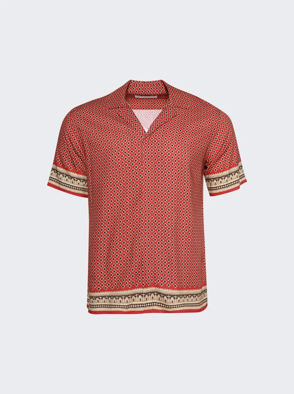 Details - Relaxed fit - Short sleeve - Classic collar - Button closure - Geometric Solmio print - Side seam hem split - Care according to label - Material: 80% viscose, 20% linen - Model is 6'1"/185cm and is wearing a size M Brand Style: 280074 Designer/Brand: ORLEBAR BROWN