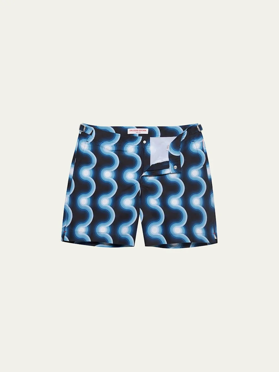 Orlebar Brown "Bulldog" swim shorts in wave print Approx. 6" inseam Signature side fasteners Concealed snap closure Side slant pockets Back zip pocket Mid length Polyester Machine wash cold Made in Portugal Model is 6'1"/185cm. Online Inquiries: BGS21_NBRFM| Store Inquiries: #4703044