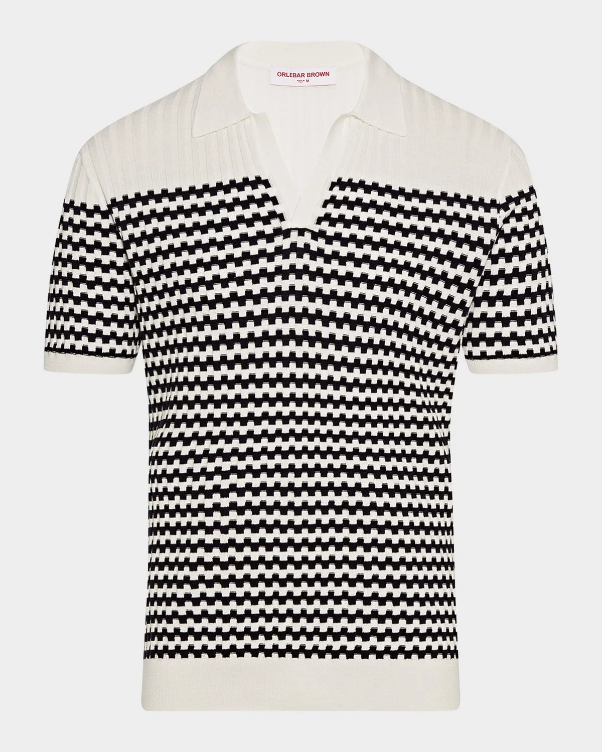 - Orlebar Brown "Canet" 12-gauge knit polo shirt featuring textural two-tone placement stripes - Spread collar; buttonless placket - Short sleeves - Straight hem - Tailored fit - Pullover style - Organic cotton - Hand wash - Made in Italy - Model is 6'1"/185cm.
