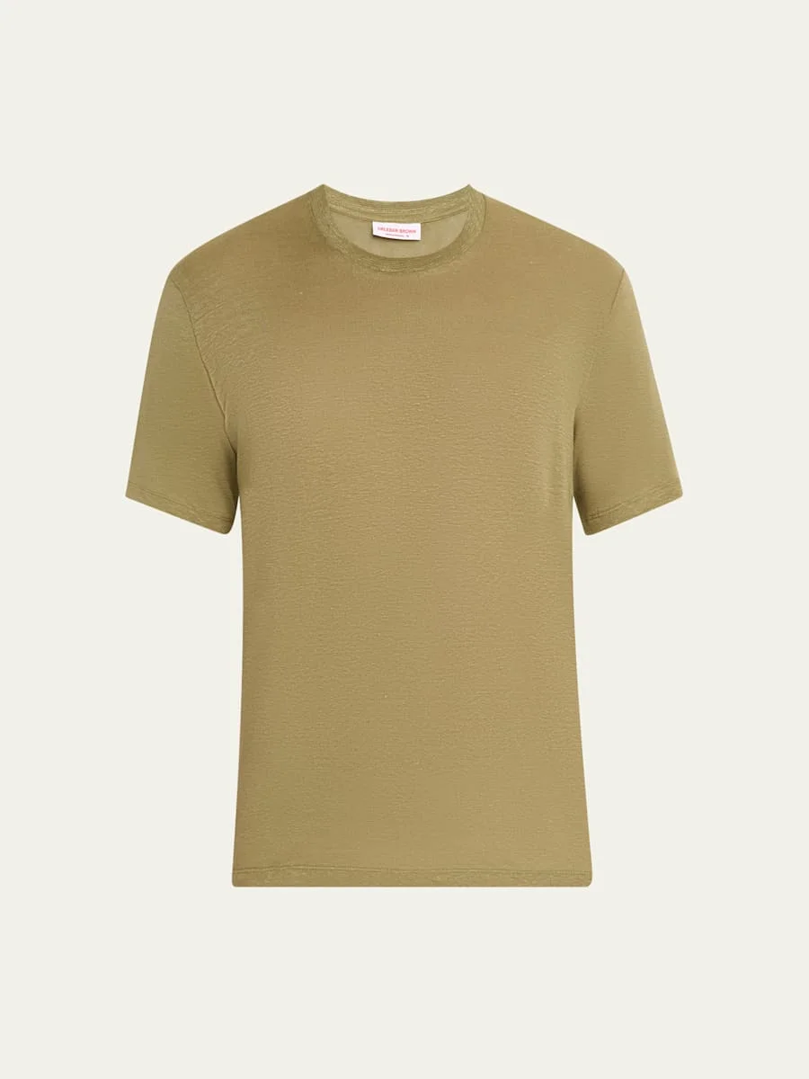 Orlebar Brown solid T-shirt in linen-stretch jersey, knitted in Italy Twin needle finish at hem and cuff Crew neckline Short sleeves Tailored fit Straight hem Classic fit Pullover style Linen/elastane Made in Portugal Online Inquiries: BGS21_NDG2D| Store Inquiries: #5037061