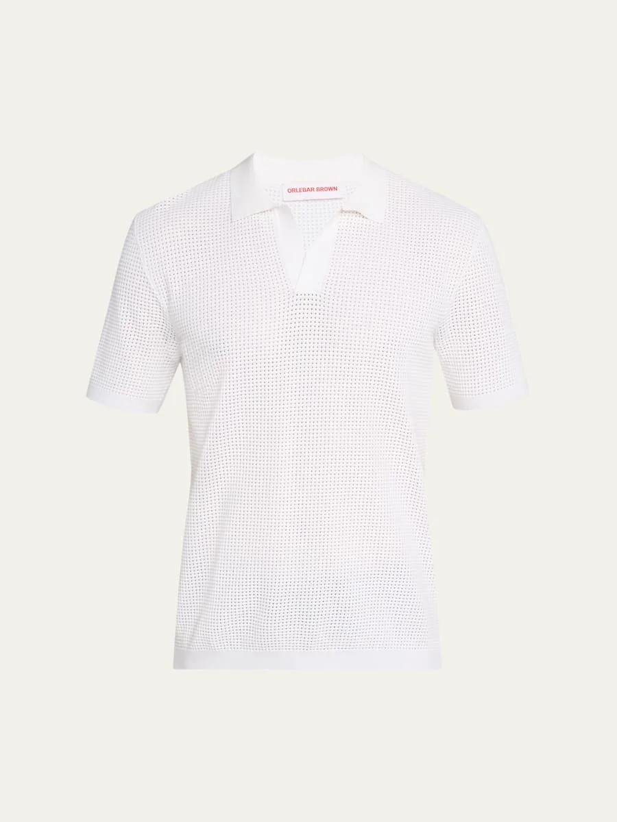 Orlebar Brown "Roddy" polo shirt features open mesh stitching for an attractive, luxe texture Resort placket Short sleeves Classic fit Hand embroidered O.B stripe branding at side seam Viscose/polyester Dry clean Made in Italy Online Inquiries: BGS21_NB988| Store Inquiries: #4605500