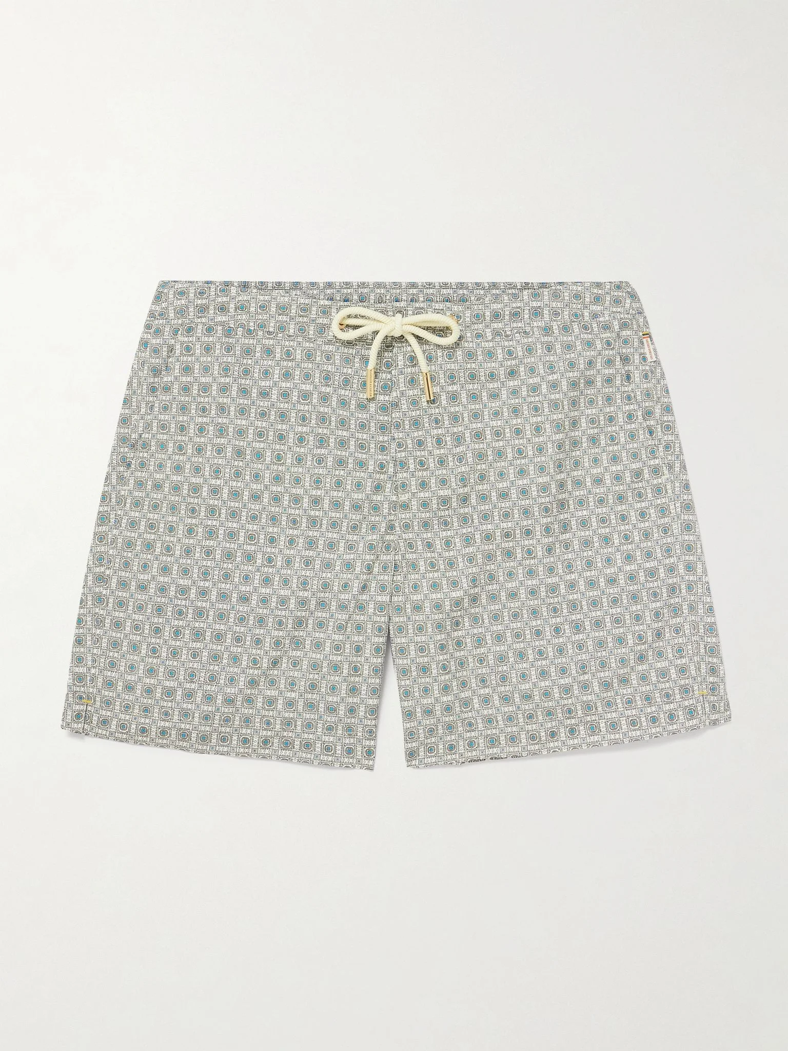 Perfect your pool or seaside style with Orlebar Brown's 'Bulldog Solstice' swim shorts. Made from recycled-shell, they’re printed in a bold geometric pattern and have an elasticated drawstring waist for comfort. Size & Fit - Fits true to size. Take your normal size - Regular-straight leg, mid-rise style - Long-length - Drawstring waist - UK/US waist sizing Details & Care - White, blue and grey recycled-shell - Snap and zip fastening - 100% recycled polyester - Designer colour: Latte