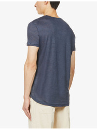 PRODUCT DETAILS - Orlebar Brown linen T-shirt - 100% linen - Pulls on - Regular fit, ribbed crew neck, short sleeves, tonal stitching, brand logo tab at front hem, round hem - Machine wash cold - Made in Portugal - Model is 6ft 2in/1.88m and wears a size medium - Lightweight, stretchy