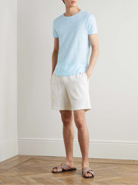 Orlebar Brown's 'OB-T' T-shirt is bound to become a favourite in your everyday wardrobe. The same style worn by James Bond in No Time To Die, it's cut from soft linen-jersey and finished with a rounded hem. Team it with loungewear for downtime, or go with swim shorts on holiday. Size & Fit - Fits true to size. Take your normal size - Designed for a slim fit - Lightweight, stretchy fabric - Model is shown wearing a M - Model measures: chest 38"/ 96cm, height 6'3"/ 191cm Details & Care - Light-blue slub linen-jersey - 100% linen - Machine wash - Designer colour: Springwater Blue