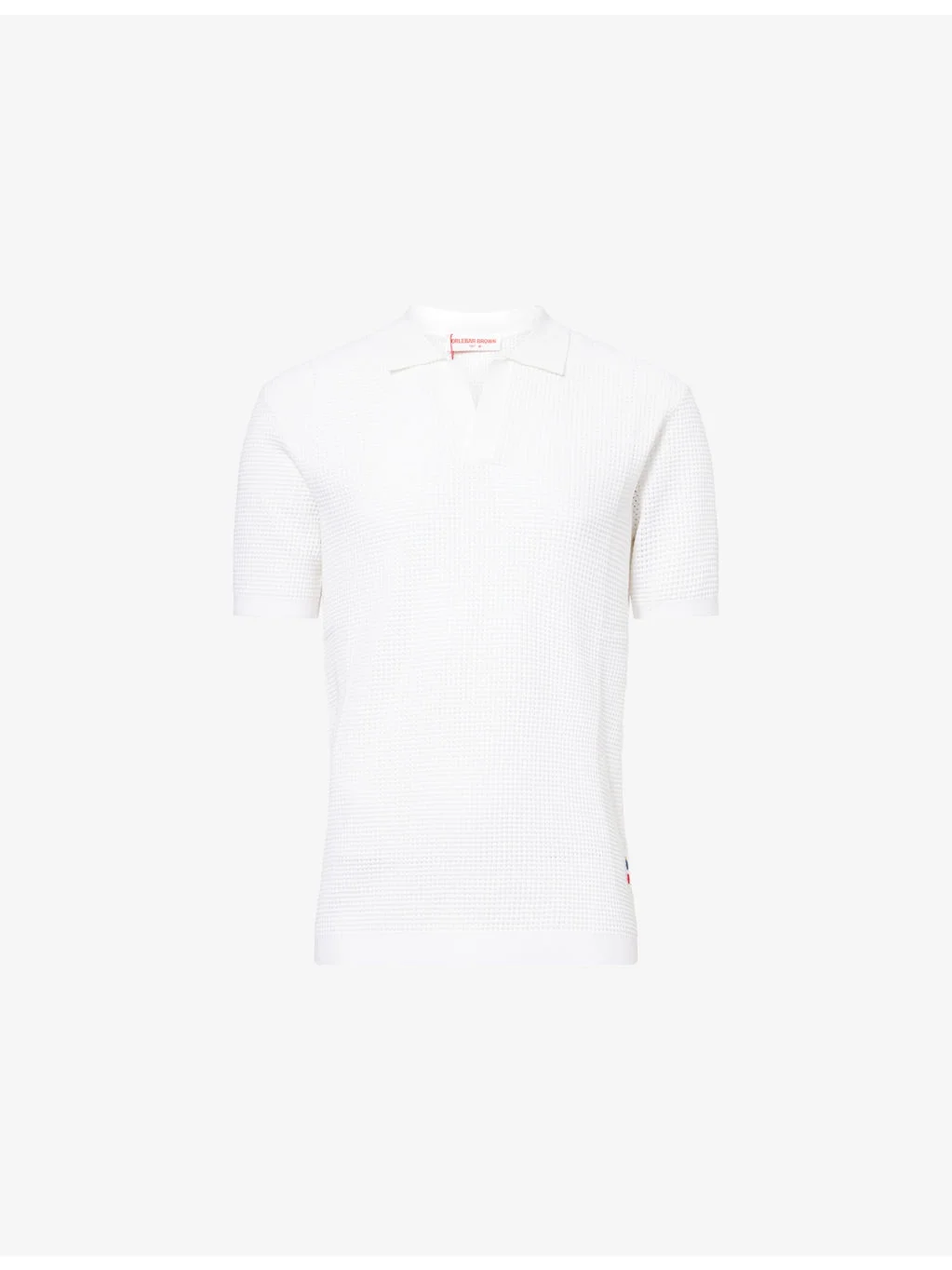 PRODUCT DETAILS - Orlebar Brown Woven Polo Shirt - 70% viscose, 30% polyester - Relaxed fit, open polo collar, short sleeves, open mesh knit design, ribbed trims - Machine wash mild - Model is 6ft 2in/1.88m and wears a size medium - Lightweight, non-stretch Ref: R04464071