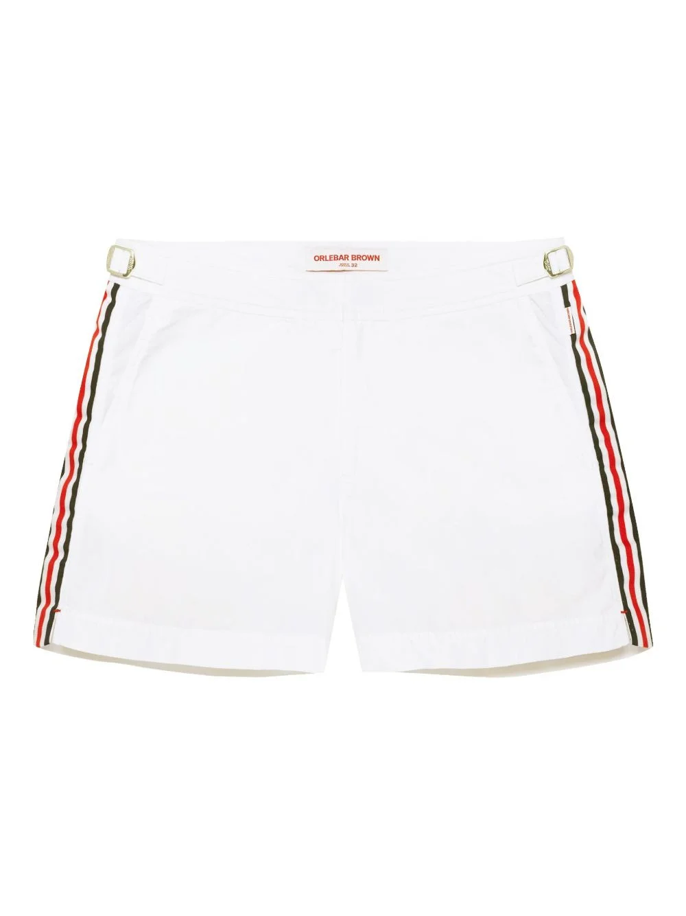 side-strap swim shorts off-white/navy blue/blood red stripe detailing mid-rise concealed front fastening two side slit pockets rear zip-fastening pocket Be mindful to try on swimwear over your own garments. Imported Composition Outer: Polyamide 100% Lining: Polyester 100%
