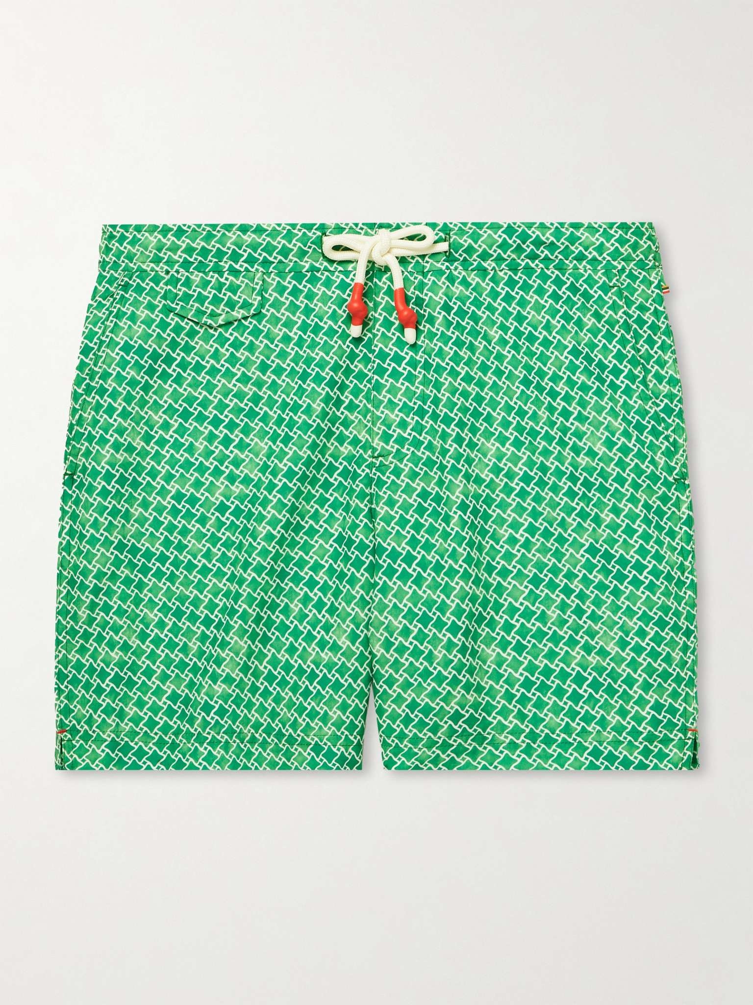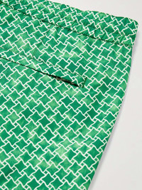 Resortwear is what Orlebar Brown does best. Cut from quick-drying shell, these swim shorts feature a wavy geometric print that mirrors ripples through a pool. They have a handy pocket and are set on an elasticated waistband with tubular drawstrings. Size & Fit - Fits true to size. Take your normal size - Slim-straight leg, mid-rise style - Mid-length - Drawstring waist - Built-in mesh briefs - Model is shown wearing a 32 - Model measures: waist size 32, height 6'2"/ 188cm Details & Care - Tonal-green and white shell - 100% polyester - Machine wash - Designer colour: Caddie Green