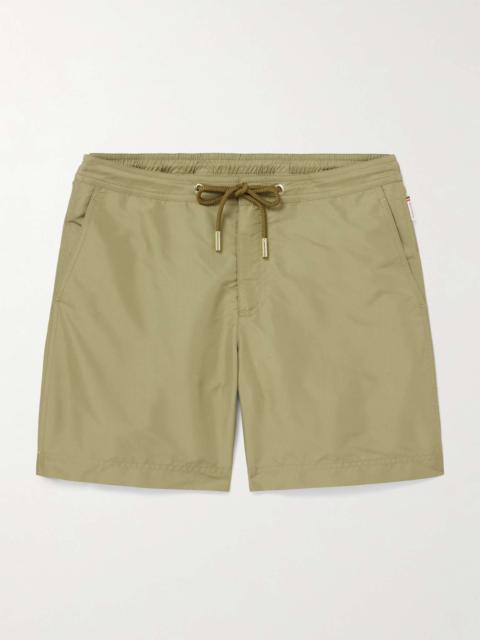 Orlebar Brown creates the kind of swim shorts you can wear in and out of the pool. Designed for a straight-leg fit, this mid-length 'Standard Terrazzo' pair is made from quick-drying recycled-shell and has a coin and zipped pocket to secure your essentials. The tubular drawcord is sealed with red rubber, which not only looks quite nautical but prevents unravelling, too. Size & Fit - Fits true to size. Take your normal size - Slim cut, mid-rise style - Mid-length - Built-in mesh briefs - Drawstring waist - Model is shown wearing a 32 - Model measures: waist size 32, height 6'1"/ 185cm Details & Care - Navy and white recycled-shell - 100% recycled polyester; lining: 95% polyester, 5% elastane - Machine wash