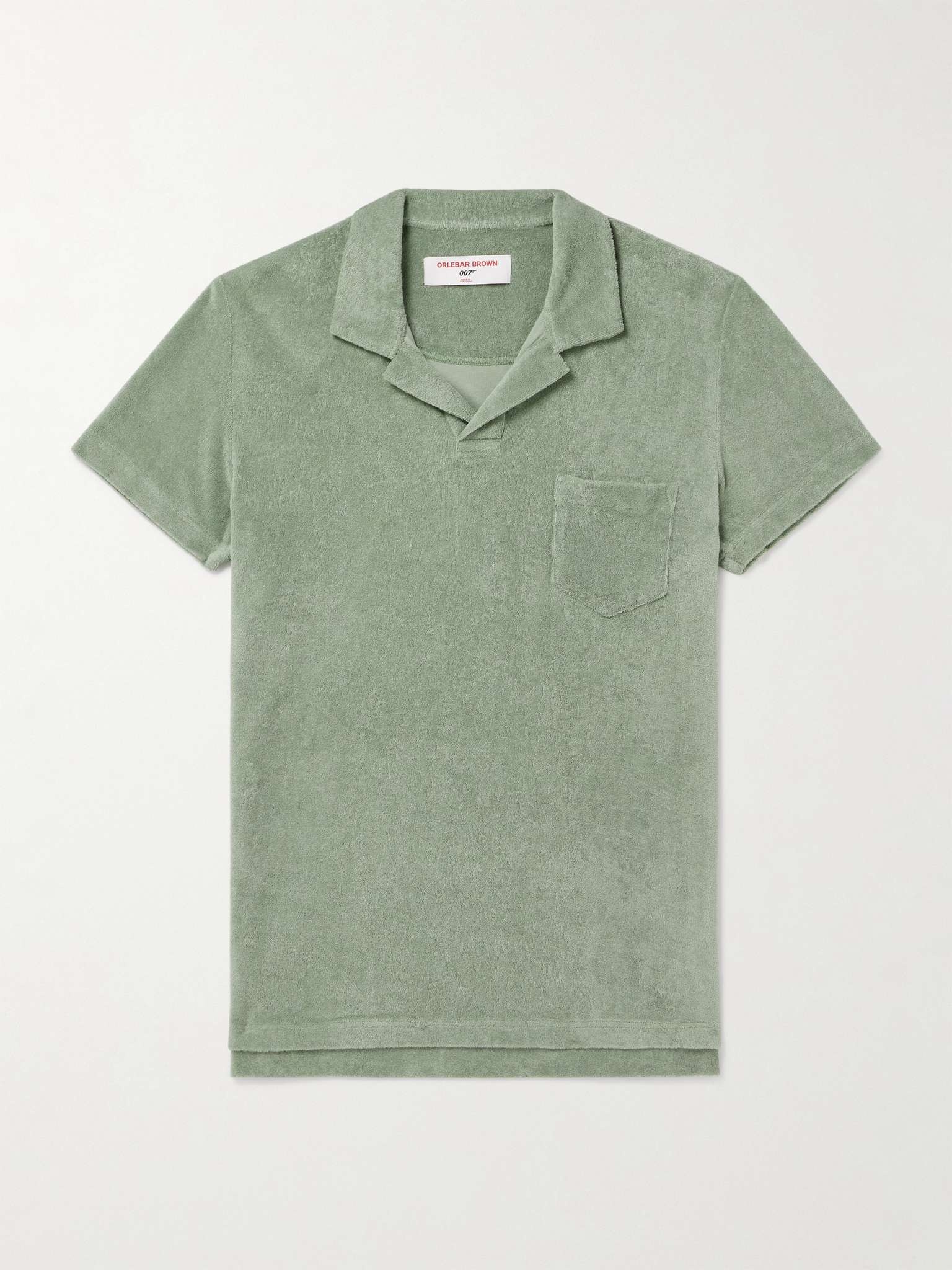 Orlebar Brown's '007' collection is inspired by the best of Bond's wardrobe. This polo shirt takes from a style seen in Dr. No, with its open collar and plush cotton-terry. Size & Fit - Fits true to size. Take your normal size - Designed for a slightly loose fit - Mid-weight, slightly stretchy fabric - Model is shown wearing a M - Model measures: chest 38"/ 96cm, height 6'1"/ 185cm Details & Care - Sage-green cotton-terry - 100% cotton - Machine wash - Designer colour: Penny Green