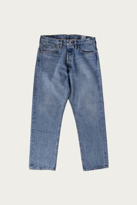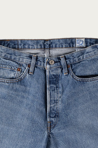 Cut from a favorite pair archived in the designers vintage collection, these jeans are both familiar and unique. The details are thoughtful. The oxidized rivets and slightly curved hip with straight waistband give them an authentic vintage feel. The denim is a Japanese 13.5oz denim that has a great 90s medium blue wash. Fit has a very light taper and fits true to size. Sizes run 1-5. 1=29-30, 2=31, 3=33, 4=34, 5=35 Model is 6'0, 175lbs, wearing size 3. - 13.5oz Japanese Denim - Rinsed and Brushed - Button Fly - Leather Patch - Made in Japan