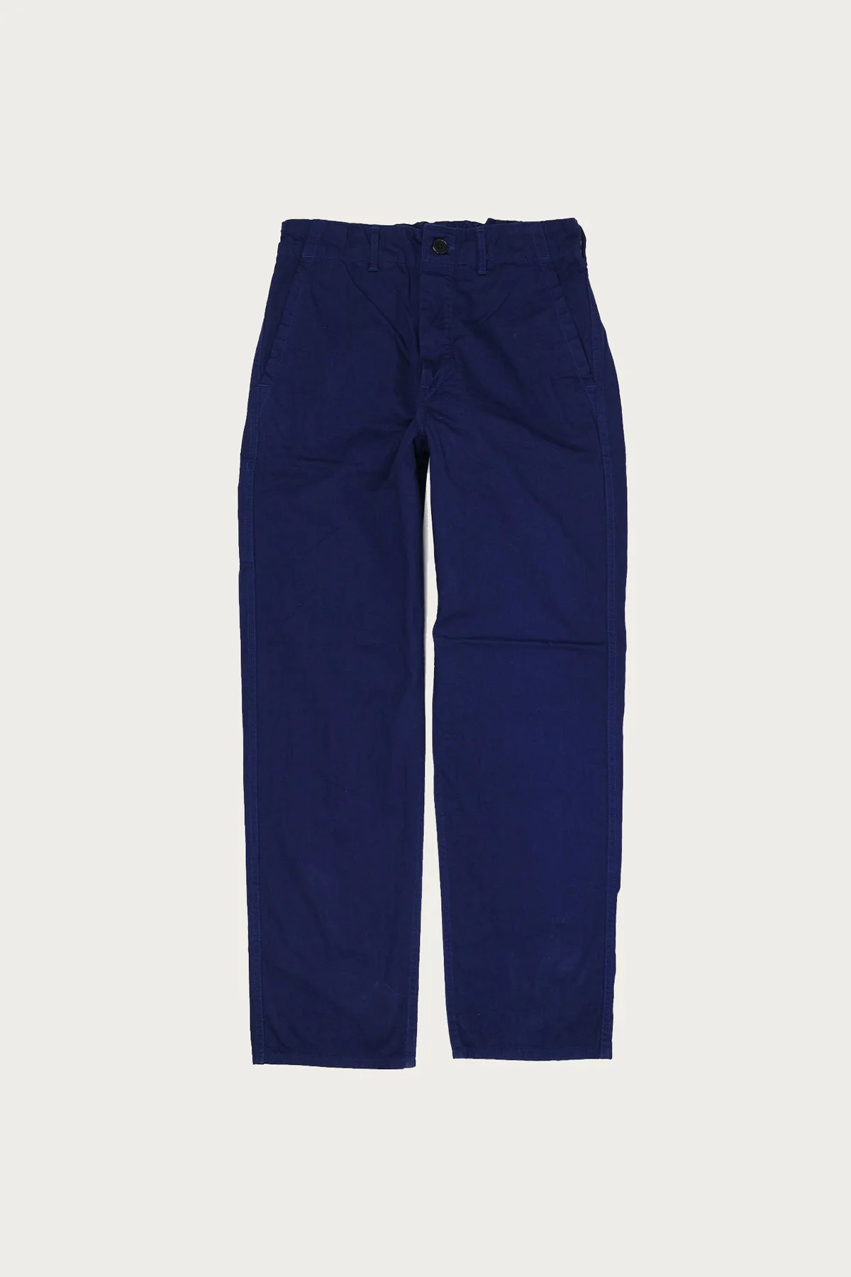 A simple, understated work pant in an indigo blue to mix it up from your favorite denim. This interpretation of the iconic French Work Pant is an easy choice. Great utility in a summer-weight, woven cotton. Fits true to size. 1=30, 2=32, 3=34, 4=36. - 100% Cotton - Semi-Elastic Waist - Slim-Straight Leg - Slash Pockets - Side Utility Pockets - Made in Japan - Blue