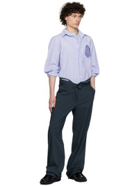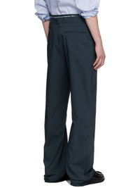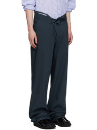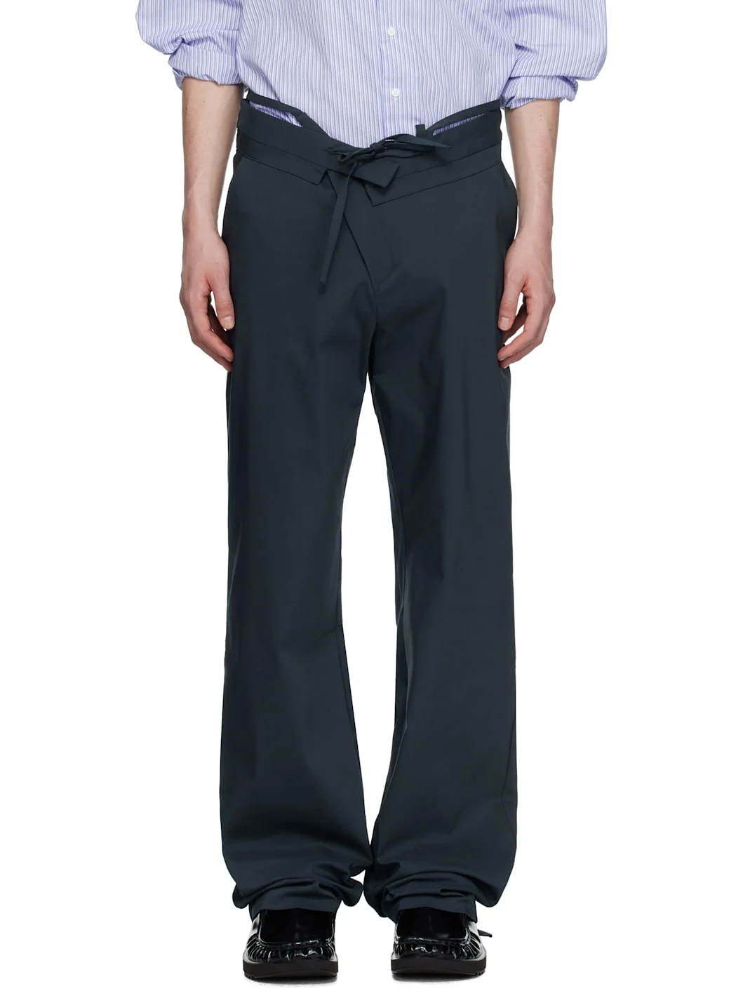 Plain-woven stretch cotton-blend trousers. · Belt-style strap and raw edges at layered waistband · Drawstring at foldover waistband · Three-pocket styling · Offset zip fly · Self-tie straps at cuffs for alternate styling Supplier color: Dark blue Body: 62% cotton, 33% polyester, 5% elastane. Lining: 94% polyester, 6% elastane. Made in Poland 251016M191001