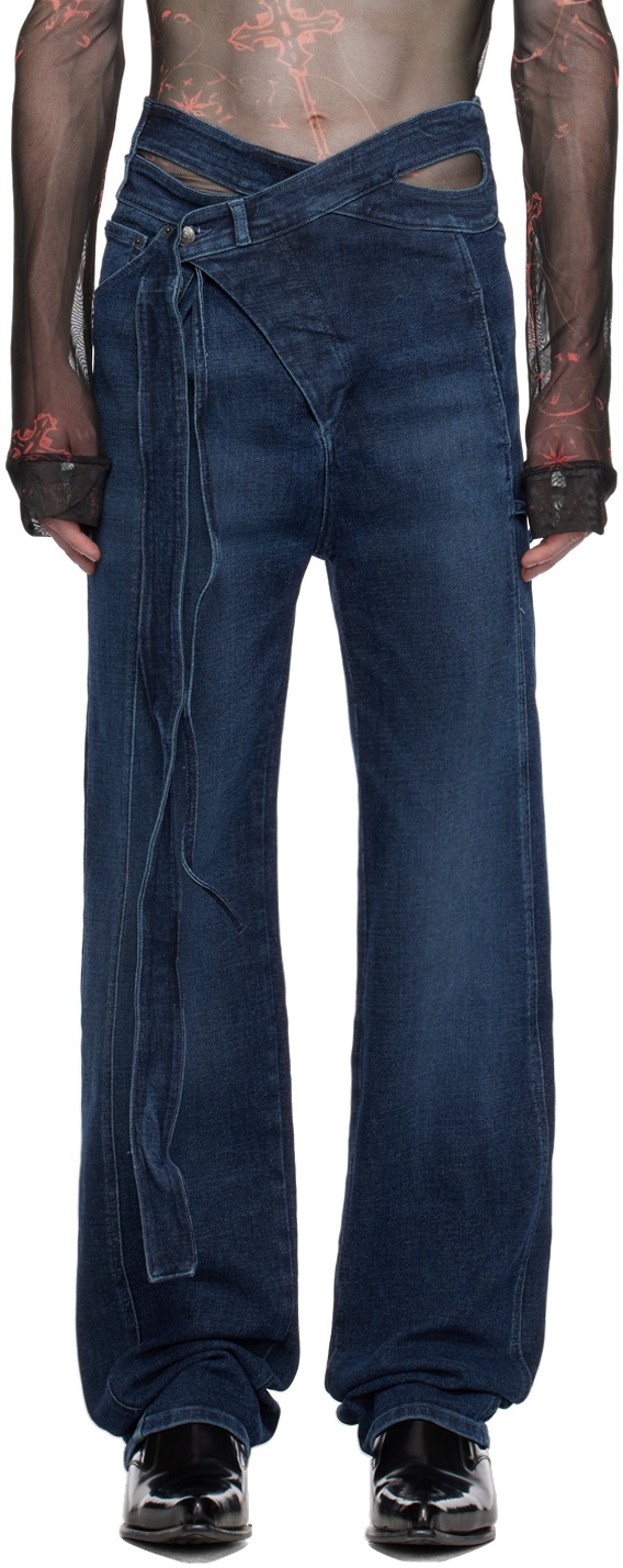 Wide-leg stretch denim jeans. Fading throughout. · Asymmetrical wrap construction · Self-tie straps, cutouts, and belt loops at modified waistband · Four-pocket styling · Offset button-fly · Extended cuffs · Rubberized logo patch at back waistband · Logo flag at back pocket Supplier color: Blue