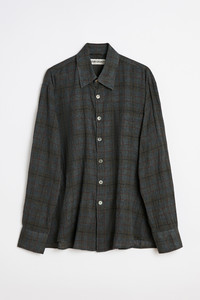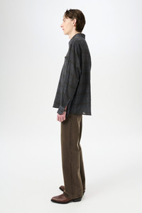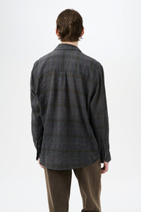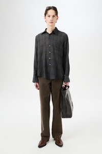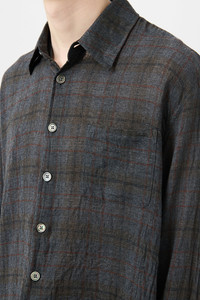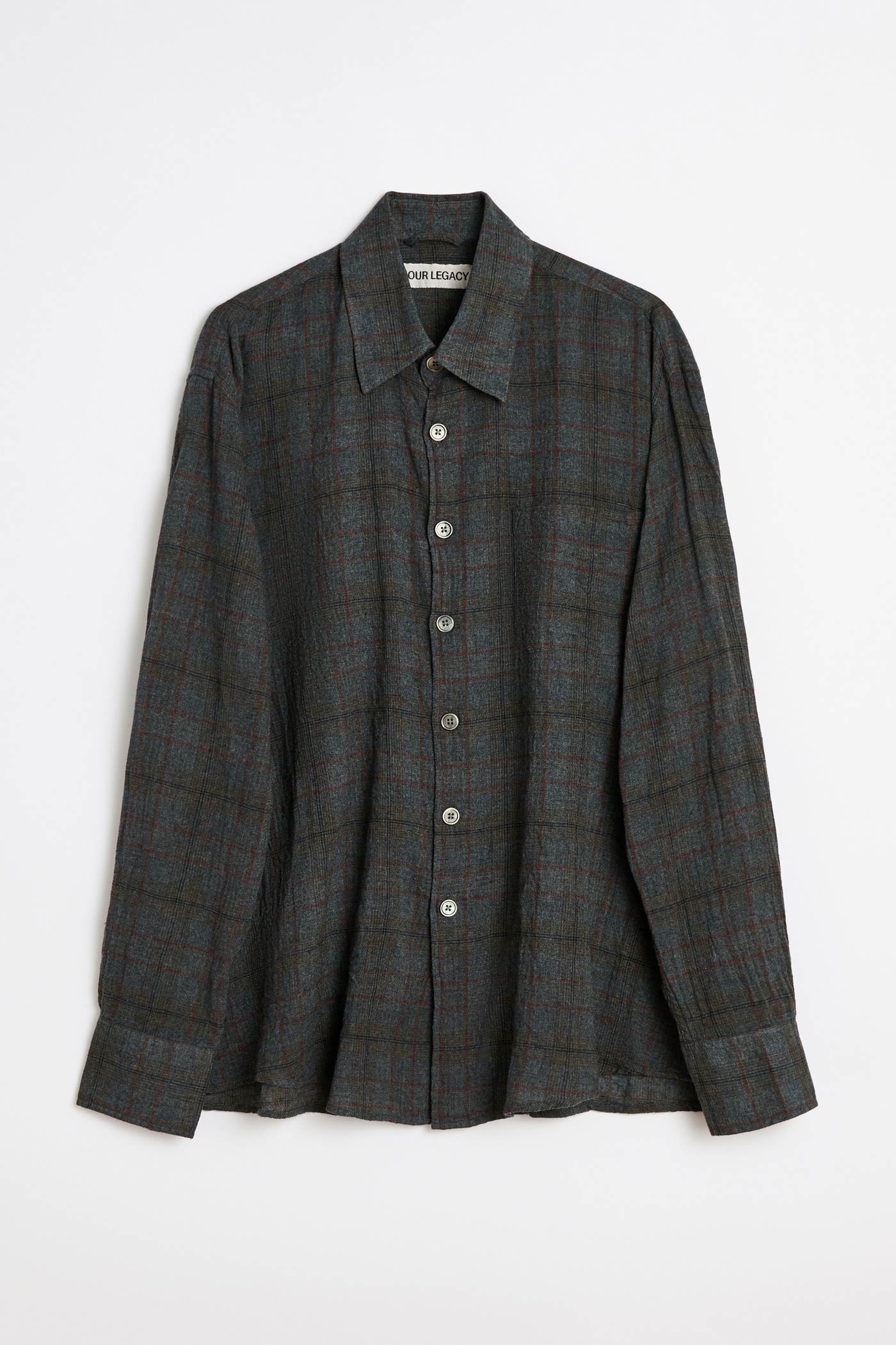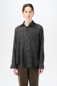 Details · Italian fabric · 50% Cotton 50% Polyester · Light weight textured check · Single chest pocket · Mother of pearl buttons · Curved hem · Mitered cuffs · Slightly oversized fit · Piece dyed · M2252ASB Description Our Above Shirt in Bazaar Check Breeze Weave. Produced in a light weight textured Italian cotton and polyester blend fabric, the mens checked Above shirt has a slightly oversized cut and features a chest pocket, mother of pearl buttons and mitered cuffs. This garment is manufactured using carefully sourced material with a unique treatment process that will give each garment an individual shade and appearance. This technique could result in some color bleed onto lighter garments or surfaces. The garment shall be shaped by its wearer and naturally distress over time to finish the design process.