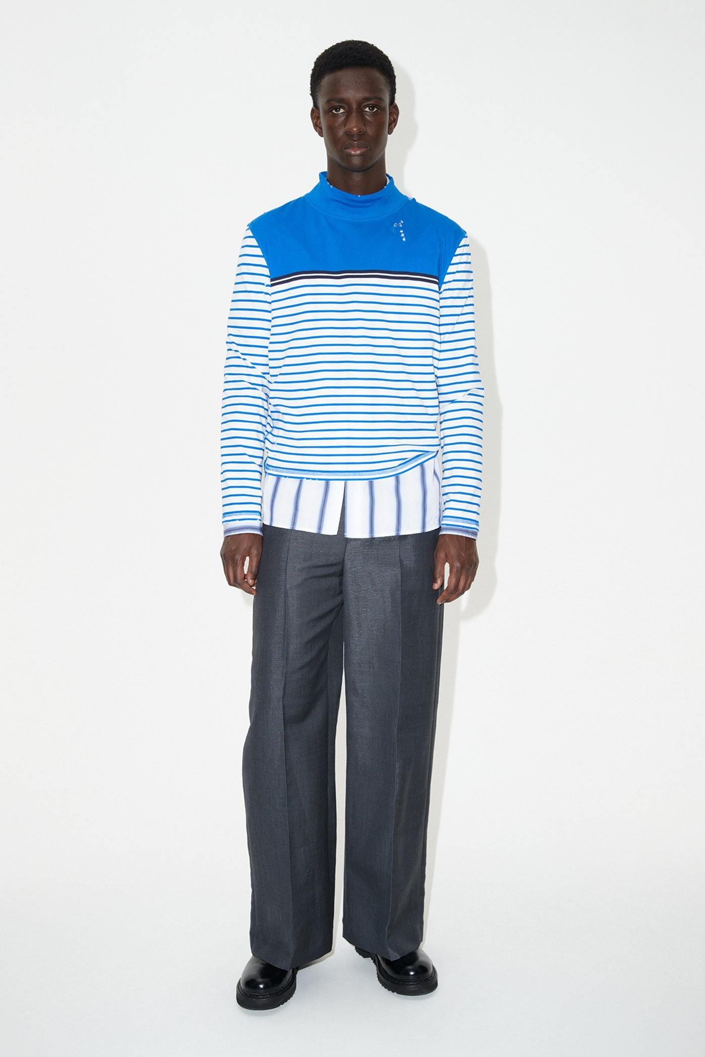 Details · Portuguese striped jersey · 100% Cotton · Trashed distressed details · Turtleneck collar · Flat lock seams · Straight hem · Boxy cropped fit · M4236AS Description Our Artist Polo in Trashed Carnot Stripe. Produced in a striped Portuguese cotton jeresey, the mens Artist Polo has a boxy, cropped fit and features trashed, distressed details, a turtleneck collar, long sleeves and a straight hem.