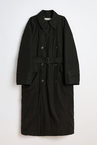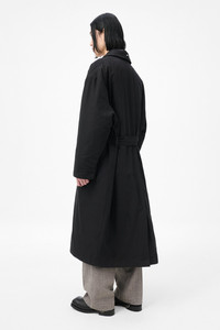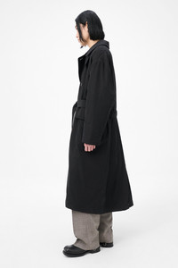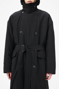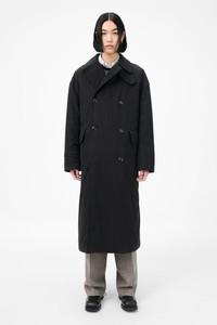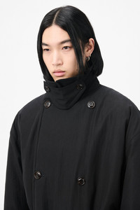 Details · Japanese fabric · 70% Cotton 30% Nylon · Lightweight technical fabric · Quilted lining · Double breasted · Belt closure with hidden loops · Detachable throat latch · Front pocket flaps · Single back vent · Corozo buttons · Inner welt pocket · OL bean rivet at collar · Oversized, generous fit · M4251DB Description Our Duvet Trench in Black Tide Cotton Nylon. Produced in Japanese lightweight technical cotton nylon fabric, the men's Duvet Trench reimagines the classic undercover trench coat with an oversized silhouette and padded quilted lining that wraps the wearer like a duvet. Features include a detachable throat latch that can be tucked away, a belt closure with sliding buckle and hidden loops, front pocket flaps, double breasted design with newly developed sustainable corozo buttons in high gloss finish, OL bean rivet at collar, single back vent and inner welt pocket.