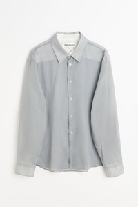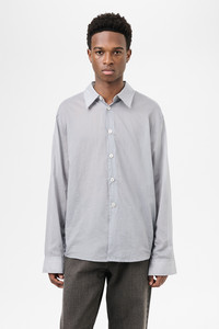 Details · Italian fabric · 100% Cotton · Piece dyed · Delicate fabric · Mother of pearl buttons · Lined collar and cuffs · Curved hem · Straight body · Regular fit · M2252BI Description Our Beyond Shirt in Ice Cold grey Cloudy Cotton. Produced in a delicate Italian fine cotton fabric, the mens Beyond Shirt has a regular, straight fit and features mother of pearl buttons, a curved hem and contrast lined collar and cuffs. This garment is manufactured using a fine and delicate material, carefully sourced for its particular characteristics. The garment shall be shaped by its wearer and naturally distress over time to finish the design process.