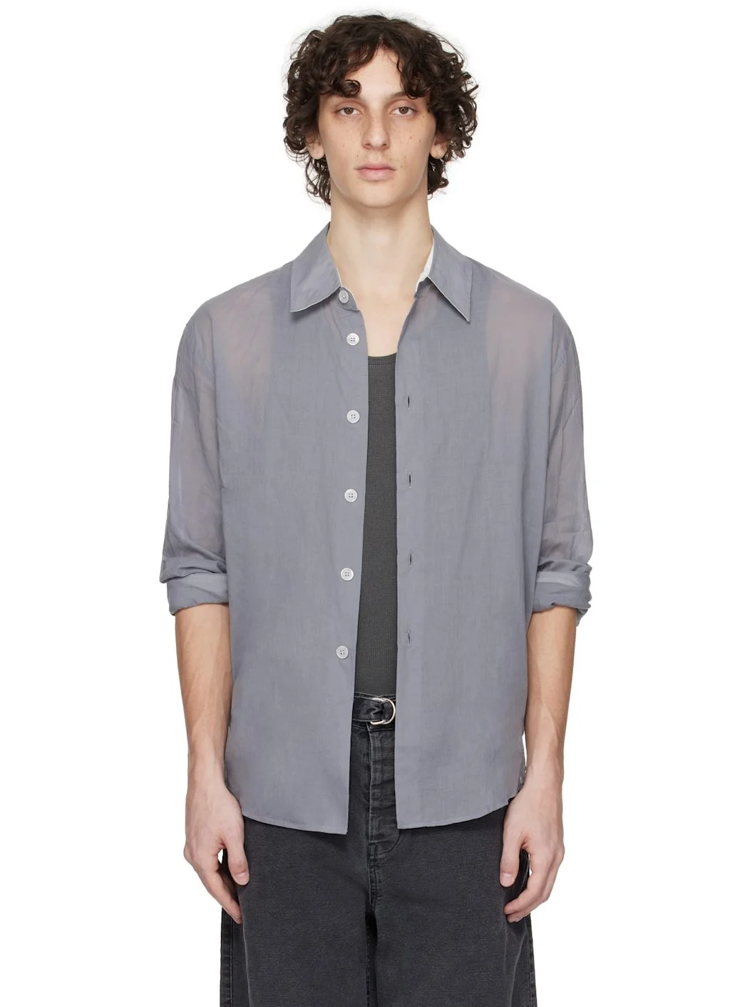 Garment-dyed sheer cotton voile shirt. · Spread collar · Button closure · Shirttail hem · Pleats at buttoned barrel cuffs · Box pleat at back yoke · Mother-of-pearl hardware Supplier color: Ice cold grey cloudy cotton 100% cotton. Made in Portugal 251803M192030