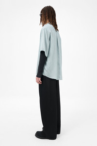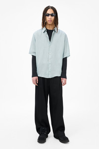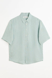 Details · Italian fabric · 84% Viscose 16% Silk · Delicate stripe · Mother of pearl buttons · Curved hem · Straight body · Regular fit · M2252BG Description Our Beyond Shirt Shortsleeve Geo Stripe Ceremonial Viscose. Produced in an Italian sheer viscose and silk blend with a delicate stripe, the mens Beyond Shirt Shortsleeve has a regular, straight fit and features slightly elongated short sleeves, mother of pearl buttons and a curved hem. This garment is manufactured using a fine and delicate material, carefully sourced for its particular characteristics. The garment shall be shaped by its wearer and naturally distress over time to finish the design process.