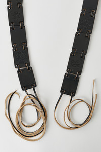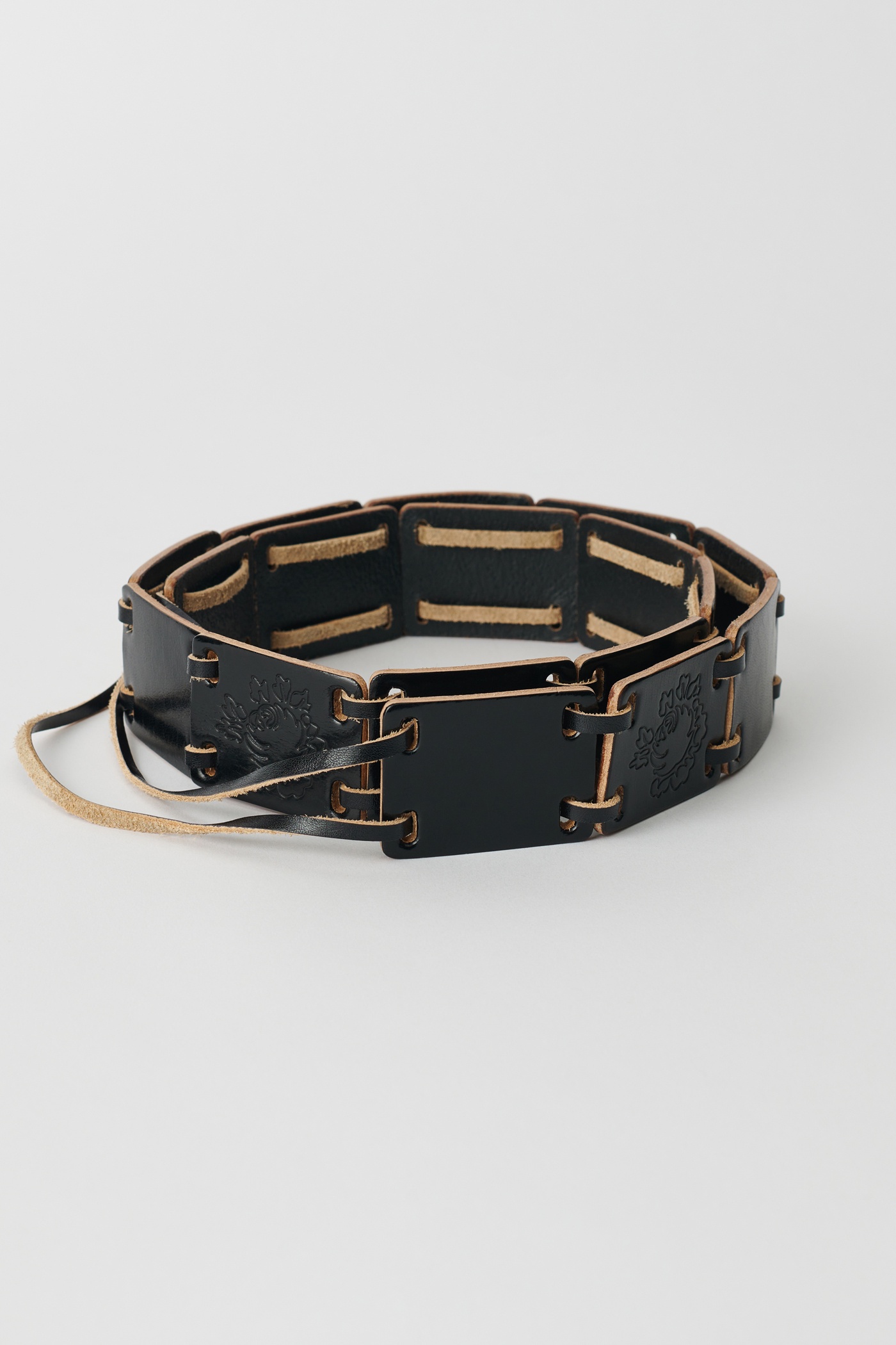 Details · Italian leather · Debossed rose pattern · Paneled construction · Leather lace closure · 38mm wide · Dust bag · A42484B Description Our Block Belt in Black Bridle Leather. Produced in an Italian cow leather with a paneled construction linked with leather straps, the belt is 3.8 cm wide and features a leather lace closure, debossed roses and a dust bag cover. The belt has a width of 3.8 cm and measures 80 cm, 90 cm or 100 cm from the end to end This product is crafted from carefully sourced leather. As a natural material, leather carries subtle traces of the animal's life. These natural imperfections bring a unique character to each product, expressing an original and authentic look. The product shall be shaped by its wearer and naturally distress over time to complete the design process.