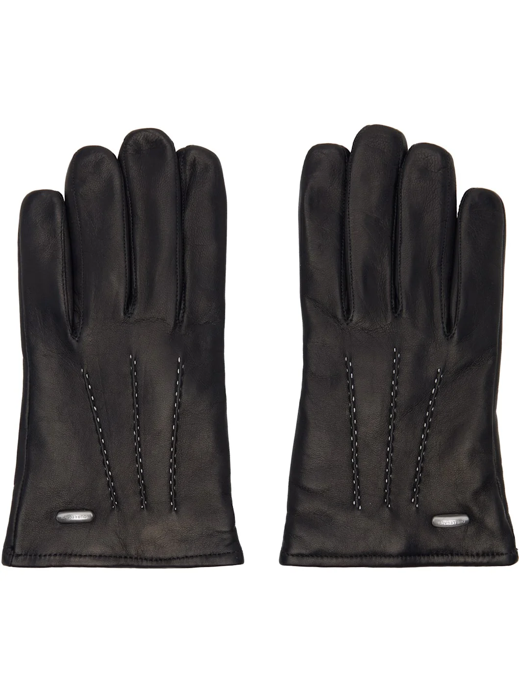 Pair of grained lambskin gloves. · Pinched seams at top · Logo hardware at partially elasticized wrist · Brushed knit wool lining Supplier color: Black Leather Body: 100% lamb leather. Lining: 100% wool. Made in Italy 261803M135003