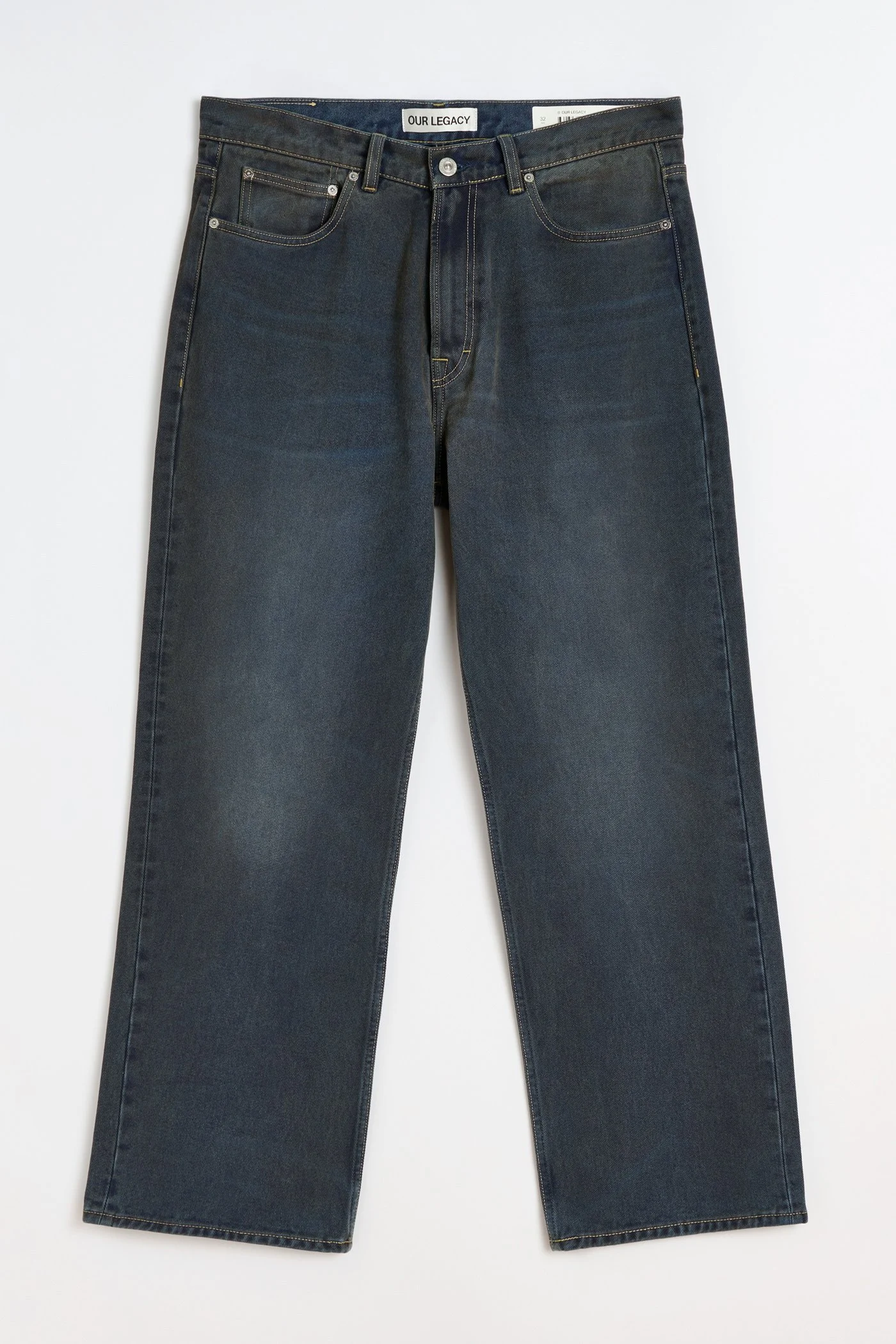 Details · Italian fabric · 100% Cotton · Indigo dyed · Hand-distressed wash process · Relaxed fit with wide straight leg · YKK zip fly · Metal rivets · Our Legacy rubber patch · Five pockets with reinforced back pockets · M4255TD Description Our Third Cut in Dusty Phantom. Produced in Italian cotton fabric, the men's Third Cut has a relaxed fit with wide straight legs and features indigo dyeing, hand-distressed wash process, YKK zip fly, metal rivets, five pockets with reinforced back pockets, and the Our Legacy rubber patch. This fabric is crafted by overdyeing ecru material with indigo, using a newly invented, fully sustainable synthetic indigo. Following the overdyeing process, artisanal treatments and fades were applied, resulting in a distinctive dirty blue tone. The aesthetic draws inspiration from vintage, distressed, and almost antique workwear, yet reimagined with a contemporary, post-apocalyptic edge. This garment is manufactured using carefully sourced material with a unique treatment process that will give each garment an individual shade and appearance. This technique could result in some color bleed onto lighter garments or surfaces. The garment shall be shaped by its wearer and naturally distress over time to finish the design process.