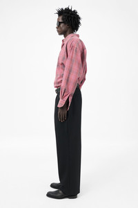 Details · Portuguese fabric · 100% Wool · Fine grain texture · OL embroidery · Pleated front · Two side pockets · Two back welt pockets · Horn buttons · YKK zip fly · Covered hook-and-eye waistband fastening · Wide legged relaxed fit · M421BBPW Description Our Borrowed Chino in Black Panama Wool. Produced in a fine grain Portuguese wool cloth, the mens wide legged Borrowed Chino has a relaxed fit and features front pleats, a YKK zip fly and a hidden hook and eye waist closure.