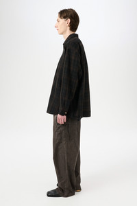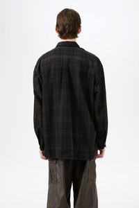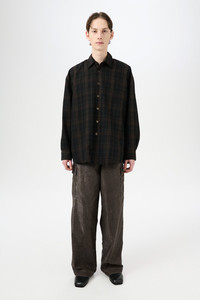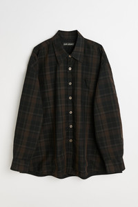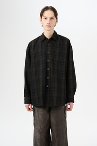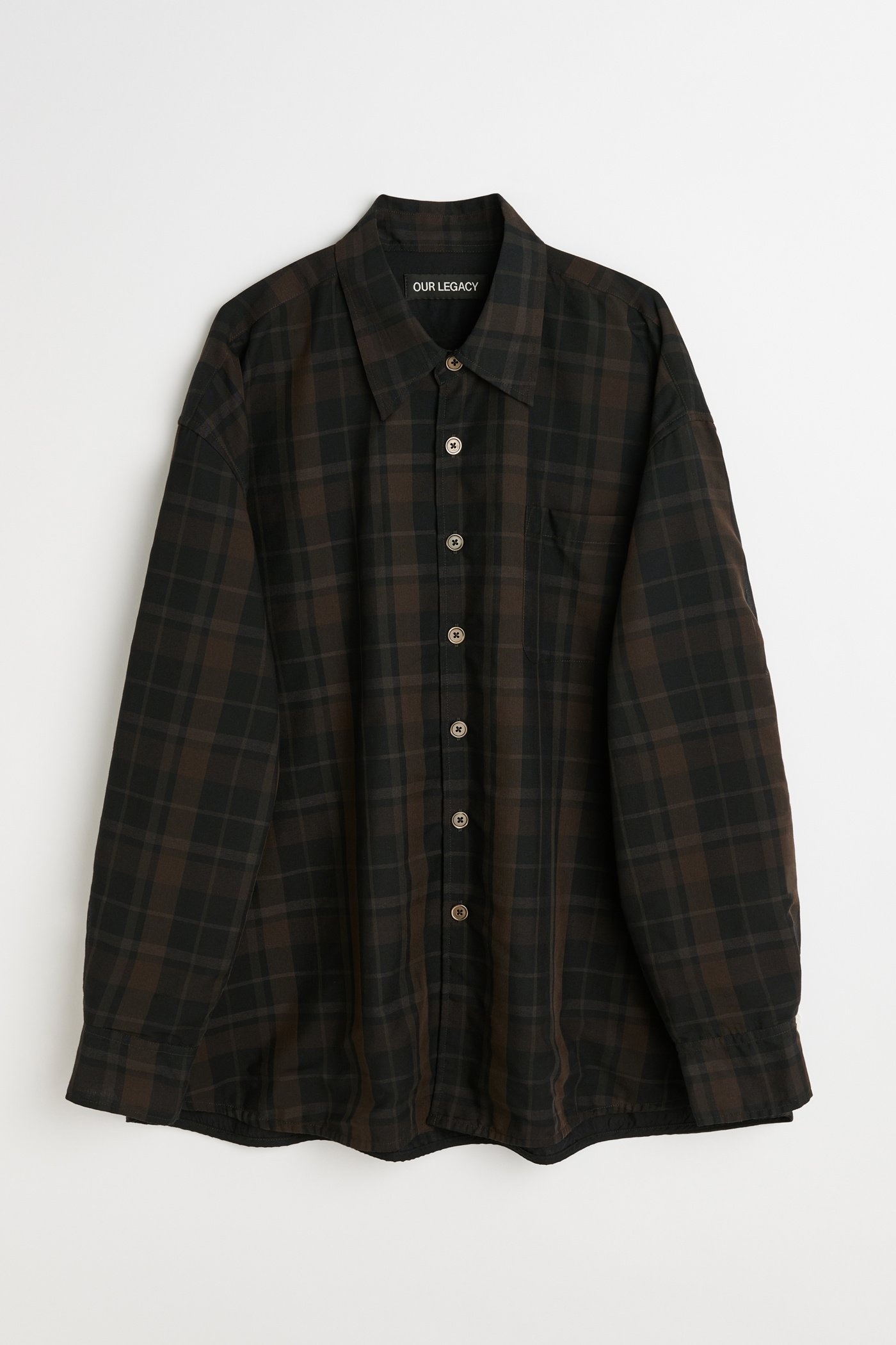 Details · Japanese check fabric · 55% Polyester 45% Cotton · Fully lined · Mother of pearl buttons · Single chest pocket · Mitered cuffs · Curved hem · Oversized fit · M2252OB Description Our Borrowed Shirt in Black Sheer Shadow Check. Produced in a delicate Japanese polyester and cotton blend checked fabric, the lined mens Borrowed Shirt has a wide oversized cut and features mother of pearl buttons, a single chest pocket, mitered cuffs, and a curved hem. This garment is manufactured using a fine and delicate material, carefully sourced for its particular characteristics. The garment shall be shaped by its wearer and naturally distress over time to finish the design process.