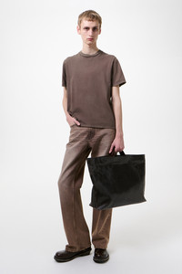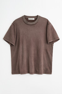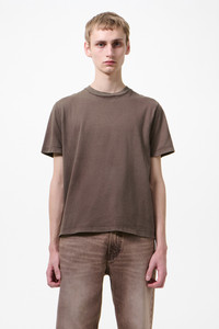 Details · Portuguese jersey · 100% Cotton · Natural pigment dyed · Ribbed collar · Straight hem · Boxy fit · M2266BWB Description Our Box T-shirt in Worn Brown Legacy Jersey. Produced in Portuguese cotton jersey, the men's Box T-shirt has a boxy fit and features natural pigment dyeing, a ribbed collar and a straight hem. This garment is manufactured using carefully sourced material with a unique treatment process that will give each garment an individual shade and appearance. This technique could result in some color bleed onto lighter garments or surfaces. The garment shall be shaped by its wearer and naturally distress over time to finish the design process.