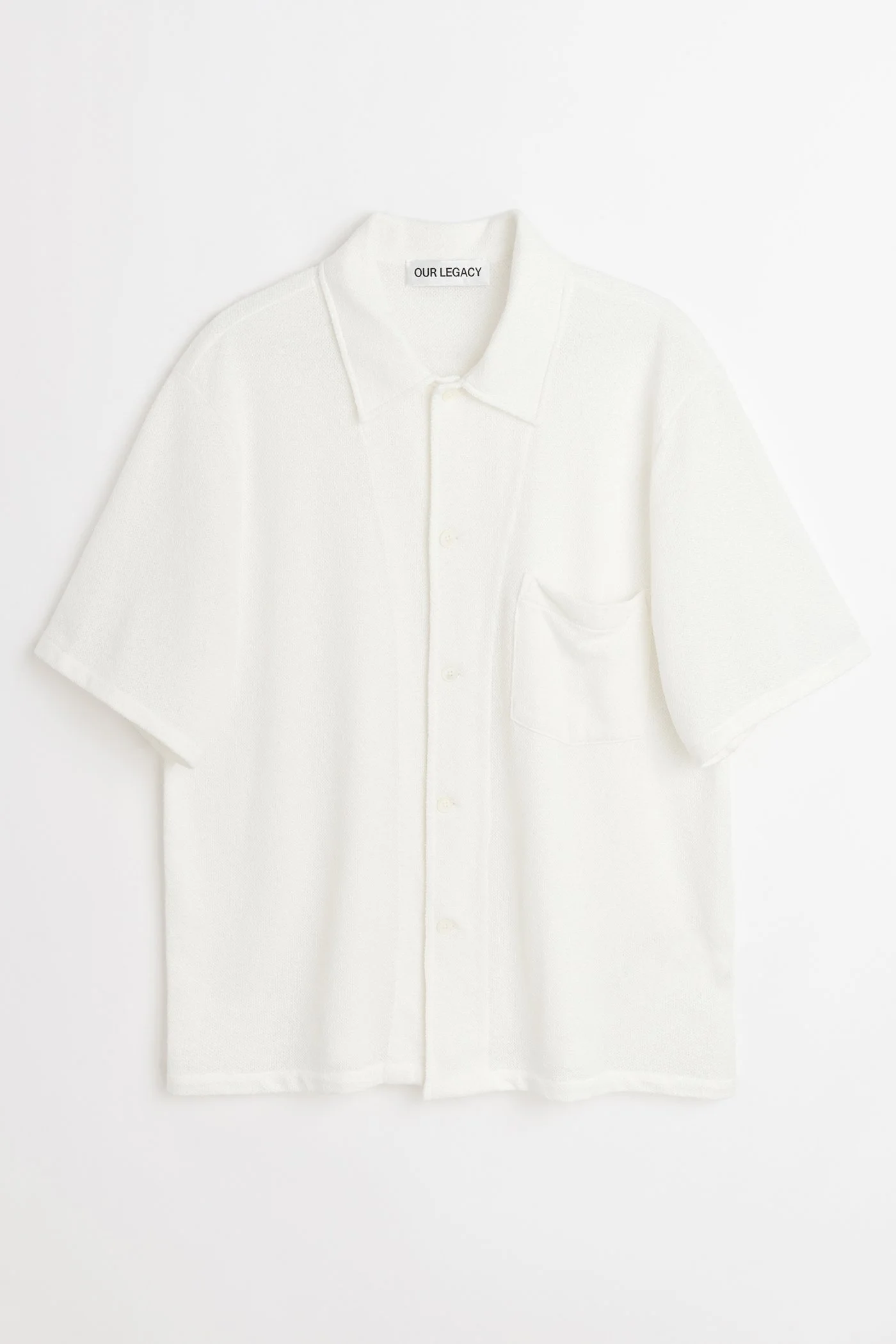 Details · Italian fabric · 49% Cotton 27% Polyester 24% Polyamide · Boucle texture · Mother of pearl buttons · Single chest pocket · Wide placket · Straight hem · Boxy fit · M2202BO Description Our Box Shirt Shortsleeve in White Boucle. Produced in an Italian boucle fabric, the mens Box Shirt Shortsleeve has a boxy fit, and features a single chest pocket, large white pearl buttons and a straight hem.