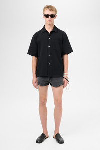 Details · Portuguese fabric · 100% Cotton · Textured crochet weave · Mother of pearl buttons · Single chest pocket · Wide placket · Straight hem · Boxy fit · M2252BBW Description Our Box Shirt Shortsleeve in Black Crochet Weave. Produced in a Portuguese cotton fabric with a textured crochet weave, the mens Box Shirt Shortsleeve has a boxy fit, and features a single chest pocket, large white pearl buttons and a straight hem. This garment is manufactured using a delicate material with a naturally loose construction. Please handle with care and wash according to washing instructions. Be especially careful with jewelry and other pointed objects that might harm the surface.
