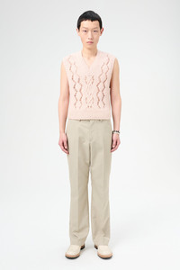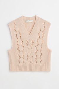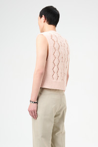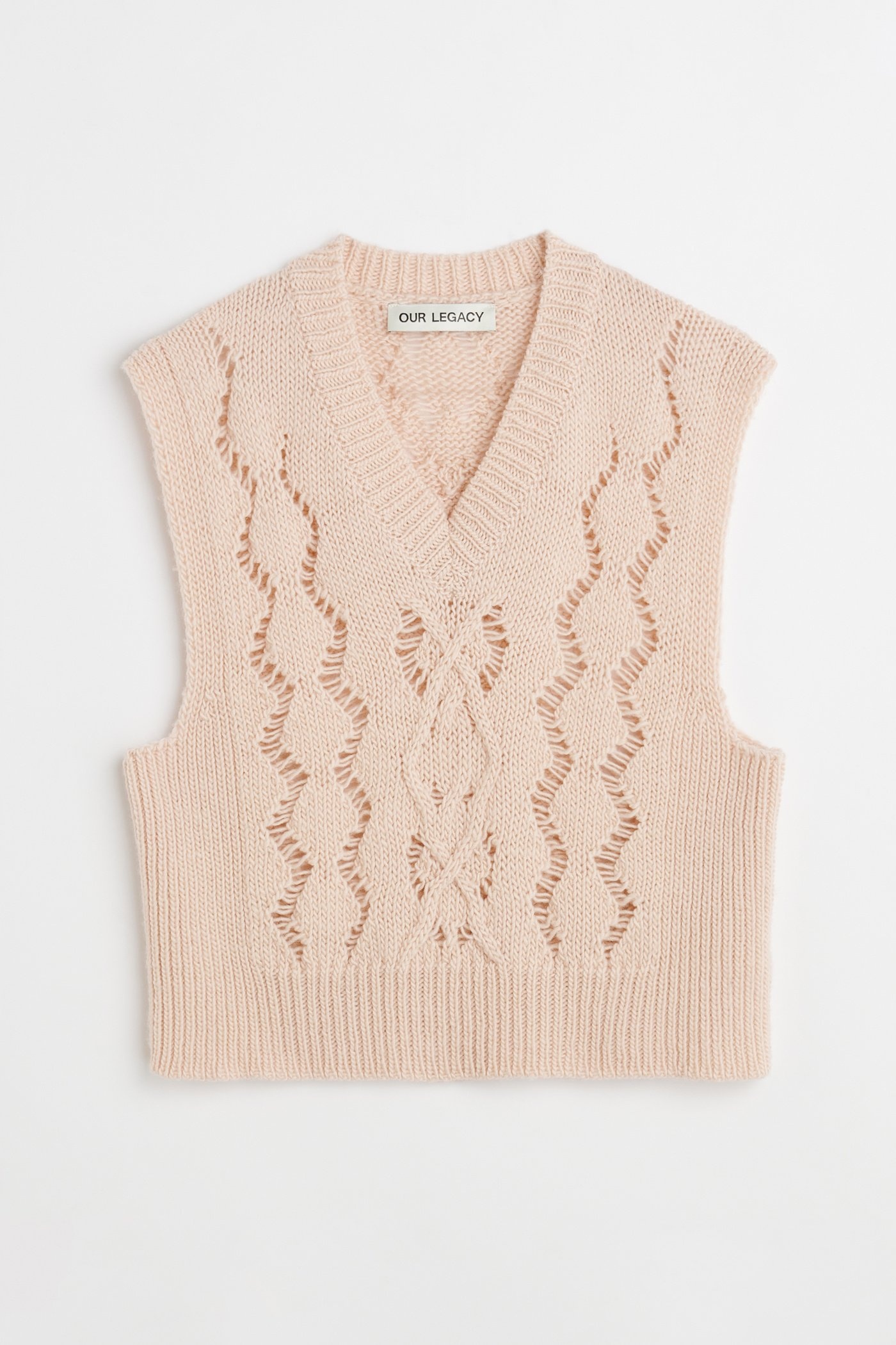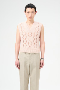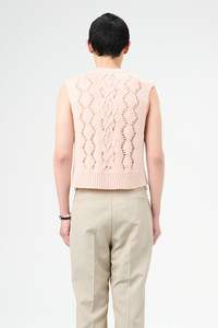 Details · Italian yarn · 100% Lana Wool · V neck collar · Open cable knit · Regular, cropped fit · M4243CD Description Our Cable Michigan Tank in Delicate Pink Fisherman Wool. Produced in a Italian lana wool yarn, the sleeveless mens Cable Michigan Tank has a regular, cropped fit and features a v-neck collar and open cable knit. This garment is manufactured using a carefully sourced yarn. The natural characteristics of the yarn, combined with the construction of the knit allows the garment to expand when worn. The garment shall be shaped by its wearer and naturally distress over time to finish the design process. To help keep the integrity of the garment please store the garment folded.