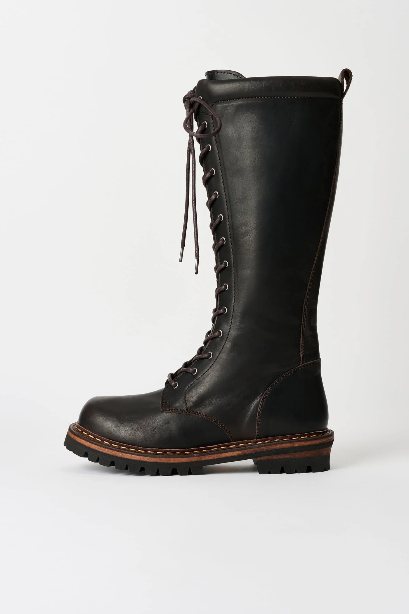 Details · English calf leather · Full grain · Vibram lugged sole · Kilger leather midsole from Germany · Lace closure · Metal eyelets · Lampo zip side closure · Mesh lining · Padded tongue and opening edge · A2267CD Description Our Cager Boot in Dark Chocolate Rich Calfskin. Produced in full grain leather, the Cager Boot features a lace-up front with metal eyelets and an interior zip for easier wear, a Vibram lugged sole, a Kilger leather midsole from Germany, a slightly padded tongue and opening edge, mesh lining for comfort, and a tight below-knee shaft. This product is crafted from carefully sourced leather. As a natural material, leather carries subtle traces of the animal's life. These natural imperfections bring a unique character to each product, expressing an original and authentic look. The product shall be shaped by its wearer and naturally distress over time to complete the design process.