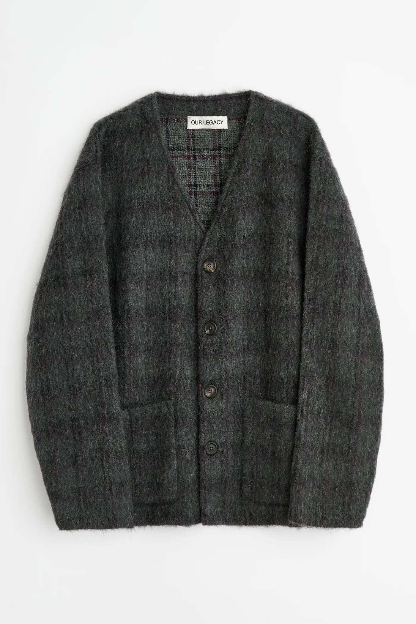 Details · Italian fabric · 36% Wool 26% Polyester 22% Acrylic · 11% Alpaca 3% Polyamide 2% Other fibers · Checked pattern · Soft, hairy texture · V-neck collar · Leather buttons · Two front pockets · Relaxed fit · M2263CF Description Our Cardigan in Fuzzed Plum Check Hairy Wool. Produced in an Italian wool, polyester, acrylic, alpaca, polyamide and other fibers blend fabric with a soft, hairy texture, the Cardigan has a relaxed fit and features a checked pattern, V-neck collar, leather buttons and two front pockets.