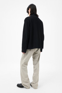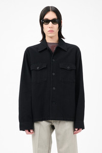 Details · Italian fabric · 100% Cotton · Piece dyed moleskin · Galalith buttons · Patch chest pockets with flap closure · Straight hem · Boxy fit · M4201EBBC Description Our Evening Coach Jacket in Black Brushed Cotton. Produced in a piece dyed Italian cotton with a soft brushed finish, our mens Evening Coach Jacket is slightly oversized with a straight, boxy fit, and features galalith buttons and patch chest pockets with flap closure. This garment is manufactured using carefully sourced material with a unique treatment process that will give each garment an individual shade and appearance. This technique could result in some color bleed onto lighter garments or surfaces. The garment shall be shaped by its wearer and naturally distress over time to finish the design process.