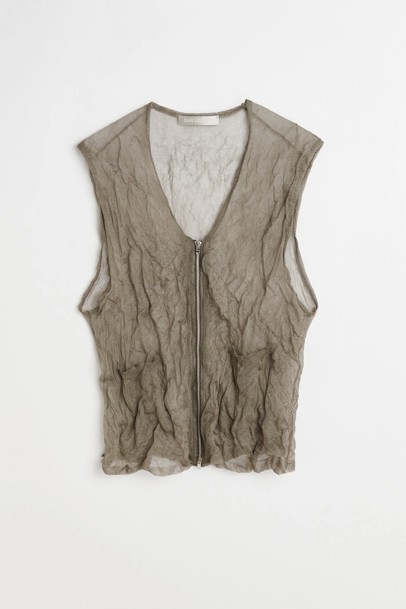 Details · Italian sheer fabric · 55% Silk 45% Metal fibre · Crushed finish · Two way zip closure · Sleeveless · Two front patch pockets · Relaxed, cropped fit · M2253CA Description Our Crush Vest in Ash Silk Steel. Produced in a sheer Italian silk and metal fibre blend fabric, the mens knit Crush Vest has a relaxed, cropped fit and features front patch pockets and a two way zip closure. This garment is manufactured using a carefully sourced yarn. The natural characteristics of the yarn, combined with the construction of the knit allows the garment to expand when worn. The garment shall be shaped by its wearer and naturally distress over time to finish the design process. To help keep the integrity of the garment please store the garment folded.