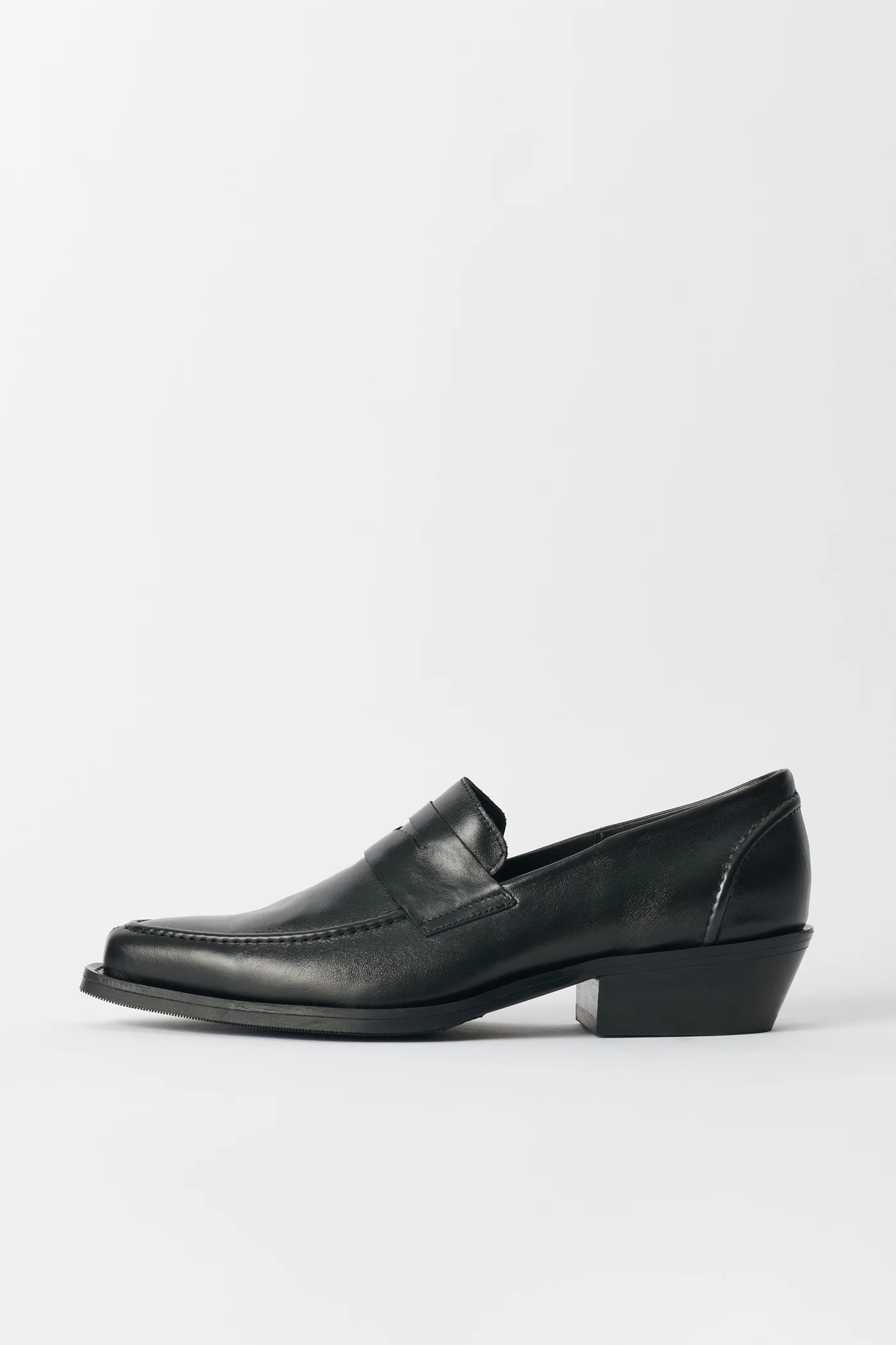 Details · Italian leather · Narrow pinch toe · Twin needle topstitched vamp · Front strap with penny slot · Leather midsole · Vibram sole · Stacked heel · Leather lined · A2257SSB Description Our Cypher Loafer in Sombre Satin Bovine. Produced in soft Italian leather, with a semi shine, the slip on Cypher Loafer features a narrow pinched toe, a Vibram sole, a leather midsole, twin needled topstiched vamp, a front strap with penny slot and a stacked heel. This product is crafted from carefully sourced leather. As a natural material, leather carries subtle traces of the animal's life. These natural imperfections bring a unique character to each product, expressing an original and authentic look. The product shall be shaped by its wearer and naturally distress over time to complete the design process.