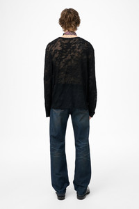 Details · Italian fabric · 100% Merino Wool · Black Flower Jacquard · U-neck collar · Dropped shoulders · Elongated sleeves · Slightly oversized, boxy fit · M4256DB Description Our Double Lock U Neck in Black Flower Jacquard Gauze. Produced in Italian merino wool fabric, the men's Double Lock U Neck has a slightly oversized, boxy fit and features a U-neck collar, dropped shoulders, and elongated sleeves. This garment is manufactured using a delicate material with a naturally loose construction. Please handle with care and wash according to washing instructions. Be especially careful with jewelry and other pointed objects that might harm the surface.