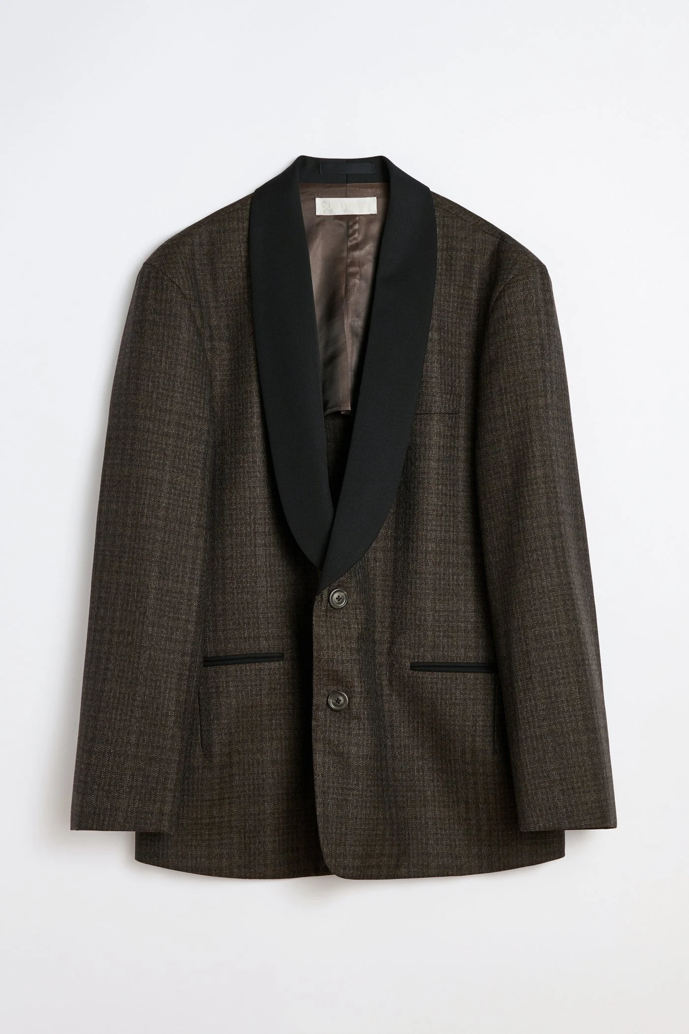 Details · Italian yarn · 100% Virgin Wool · Contrast shawl collar · Welt chest pocket · Horn buttons · Jet side pockets · Blind stitched hem · Inner pocket · M4250EB Description Our Embrace Shawl Blazer in Brown Dunmore Check. Produced in Italian virgin wool, the men's Embrace Shawl Blazer has a refined fit that leans towards the formal side and features a contrast shawl collar, welt chest pocket, horn buttons, jet side pockets, blind stitched hem and an inner pocket. This variant is an Our Legacy take on the tuxedo silhouette, crafted in heavy wool with great body and a subtle brown check design accented with sleek black wool detailing.