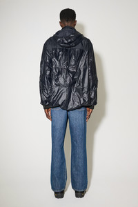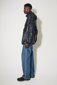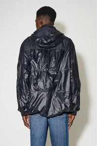 Details · Italian fabric · 88% Polyamide 12% Polyurethane · Water repellent · Snap button closure · Two front pockets · Drawstring hem · Elongated sleeves · Contrast shoulder yoke · Packable drawstring hood · Boxy fit · M2241EBR Description Our Exhaust Puffa in Black Rubberized Nylon. Produced in a water repellent Italian tech fabric, the lightweight Exhaust Puffa is a play on a classic down puffa where all the down has been blown out. The jacket has a regular, boxy fit and features a contrast shoulder yoke, two front pockets, snap button closure, a drawstring hem, and a packable hood.