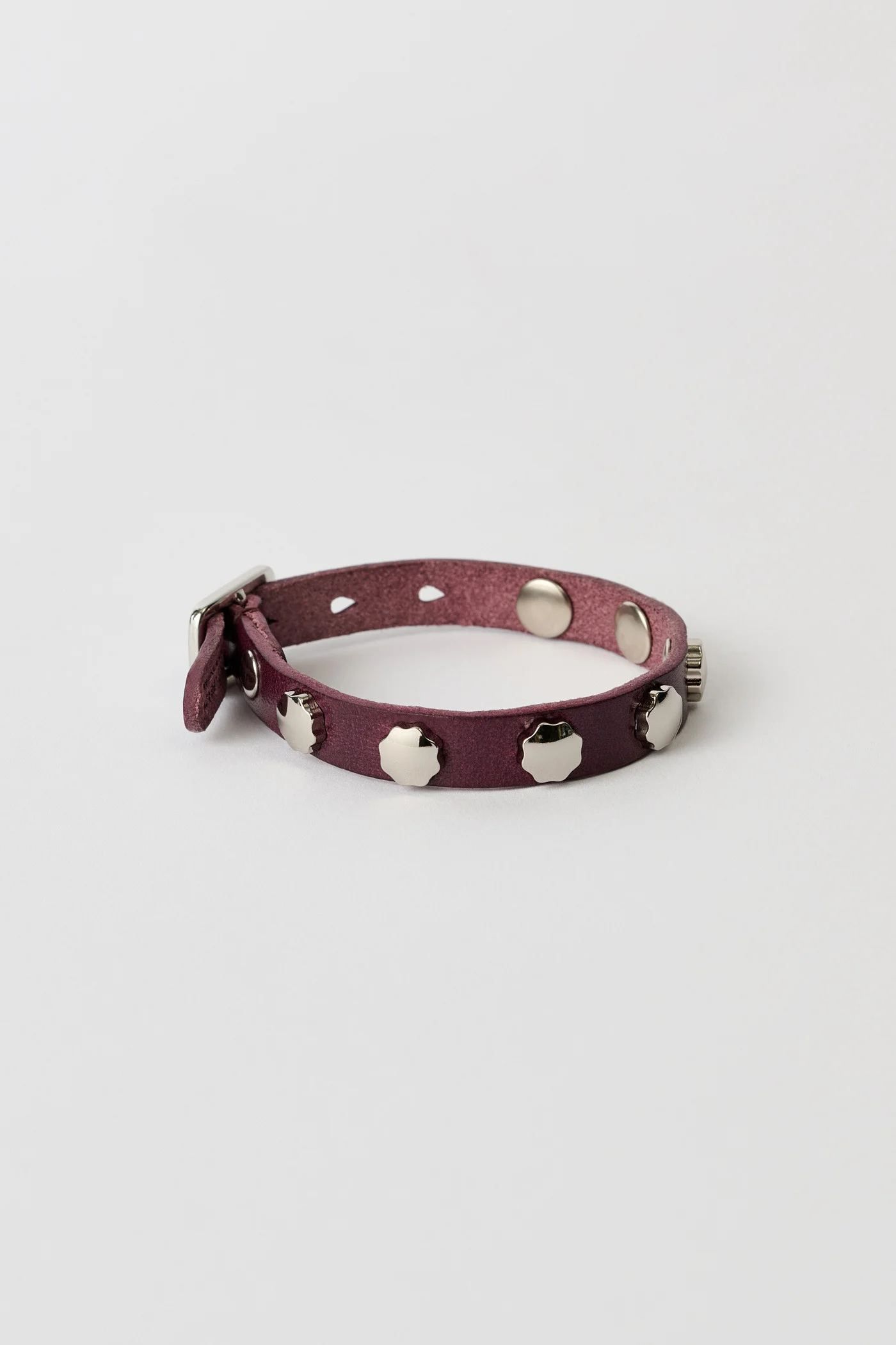 Details · Portuguese leather · Floral studs from Japan · Adjustable length · Metal pin buckle closure · 10mm wide · A4258FM Description Our Flower Bracelet in Merlot Red Leather. Produced in Portuguese cow leather, the choker features metal cross ornaments and a stud closure for adjustable sizing. The choker measures 45 cm from end to end with circumference adjustable from 42.5 cm to 30.5 cm, and comes with a dust bag. This product is crafted from carefully sourced leather. As a natural material, leather carries subtle traces of the animal's life, and the vegetable tanned leather will naturally fade over time. These characteristics bring a unique character to each product, expressing an original and authentic look that will develop and patina with wear.