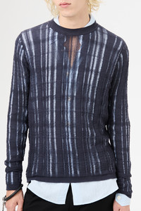 Details · Italian yarn · 78% Organic cotton 22% Polyamide · Sheer check knit · Ribbed collar, cuffs and hem · Relaxed, straight fit · M2253FW Description Our Formal Roundneck in Washed Navy Tech Cotton Produced in an Italian organic cotton and polyamide blend yarn, the sheer check knit mens Formal Roundneck has a relaxed, straight fit and features ribbed collar, cuffs and hem. This garment is manufactured using a delicate material with a naturally loose construction. Please handle with care and wash according to washing instructions. Be especially careful with jewelry and other pointed objects that might harm the surface.