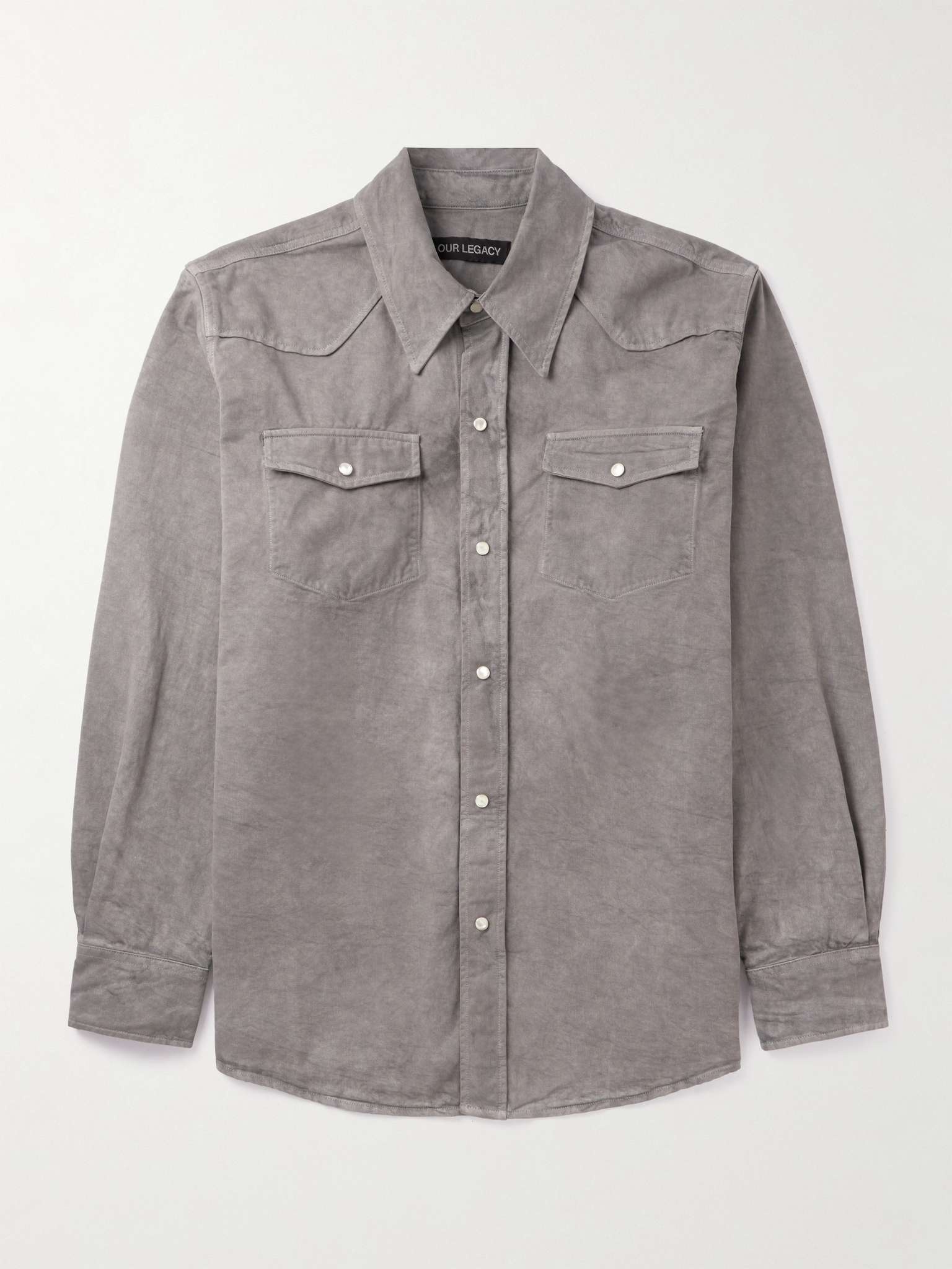 Our Legacy's 'Attic' shirt is made from denim that's washed for a vintage-style finish. It's tailored with a sharp point collar, a Western-style yoke and flap pockets, and rounded out with pearlescent snap fastenings. Size & Fit - Fits true to size. Take your normal size - Designed for a slightly loose fit - Mid-weight, non-stretchy fabric - Model is shown wearing an IT 48 - Model measures: chest 38"/ 96cm, height 6'0"/ 183cm Details & Care - Tonal-grey denim - Snap fastenings - 100% cotton - Machine wash - Mother-of-pearl: Indonesia - Designer wash: Carbon Wash Denim