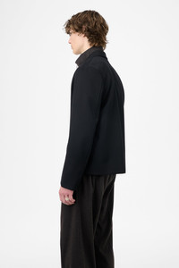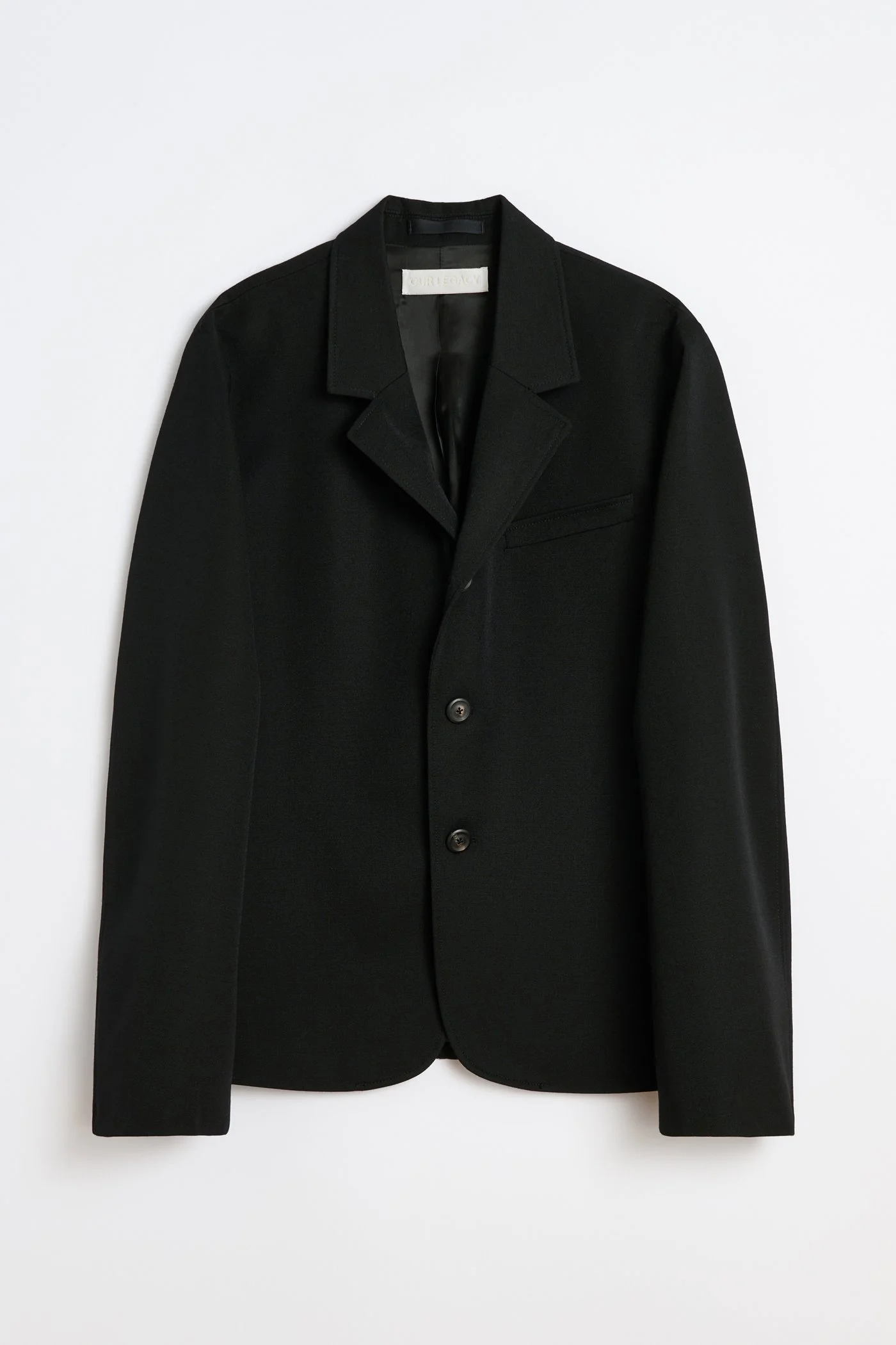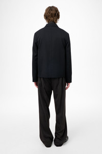 Details · Italian fabric · 100% Virgin Wool · Notched lapel · Rolling 3 button closure · Horn buttons · Angled welt chest pocket · Fully lined · Boxy, cropped fit · M4250RC Description Our Rolling Blazer in Coarse Black Gabardine. Produced in Italian virgin wool fabric, the men's Rolling Blazer has a boxy, cropped fit and features a notched lapel, rolling 3 button closure with horn buttons, an angled welt chest pocket, and full lining. The distinctive rolling third button allows for versatile styling - wear it fastened to the second button for the blazer's natural break point, or button the rolling third for a higher, closed look that creates a new lapel shape referencing workwear blazers.