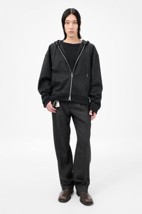 Details · Portuguese fabric · 43% Cotton 43% Polyester · 13% Polyamide 1% Elastane · Melton jersey · Drawstring hood · Lampo two way zip · Kangaroo pocket · Ribbed cuffs and hem · Dropped shoulders · Boxy, cropped fit · M4256RC Description Our Rascal Hood in Charcoal Elastic Melton. Produced in Portuguese melton jersey with a cotton, polyester, polyamide and elastane blend, the men's Rascal Hood has a boxy, cropped fit with dropped shoulders and features a drawstring hood, Lampo two-way zip, kangaroo pocket, and ribbed cuffs and hem.