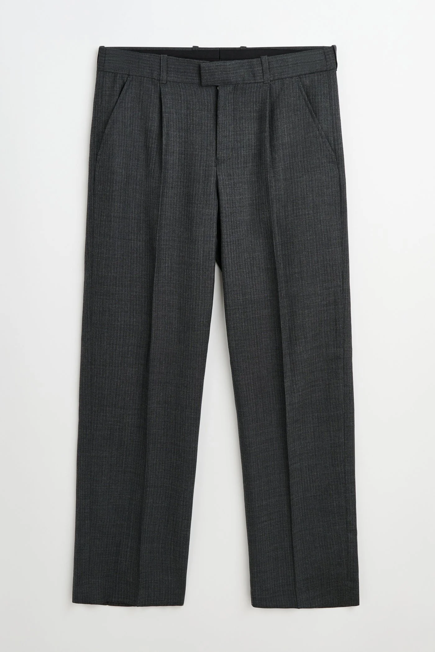 Details · Italian fabric · 100% Virgin Wool · Low rise · Hidden closure · Pre-constructed waistband · Slight bootcut · Two side pockets · Two back pockets · Corozo buttons · YKK Zip fly · M4254SS Description Our Slack Trouser in Smoke Grey Micro Herringbone Virgin Wool. Produced in Italian virgin wool fabric, the men's Slack Trouser has a relaxed fit with a lower rise and features a hidden closure, pleats at the waist, pre-constructed waistband, and a slight bootcut silhouette. The trouser includes two side pockets, two back pockets, corozo buttons, YKK zip fly, and a refined cut through the thigh that creates a sharp feeling with the slightest bootcut from the knee down for the perfect leg opening.