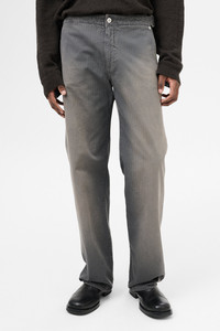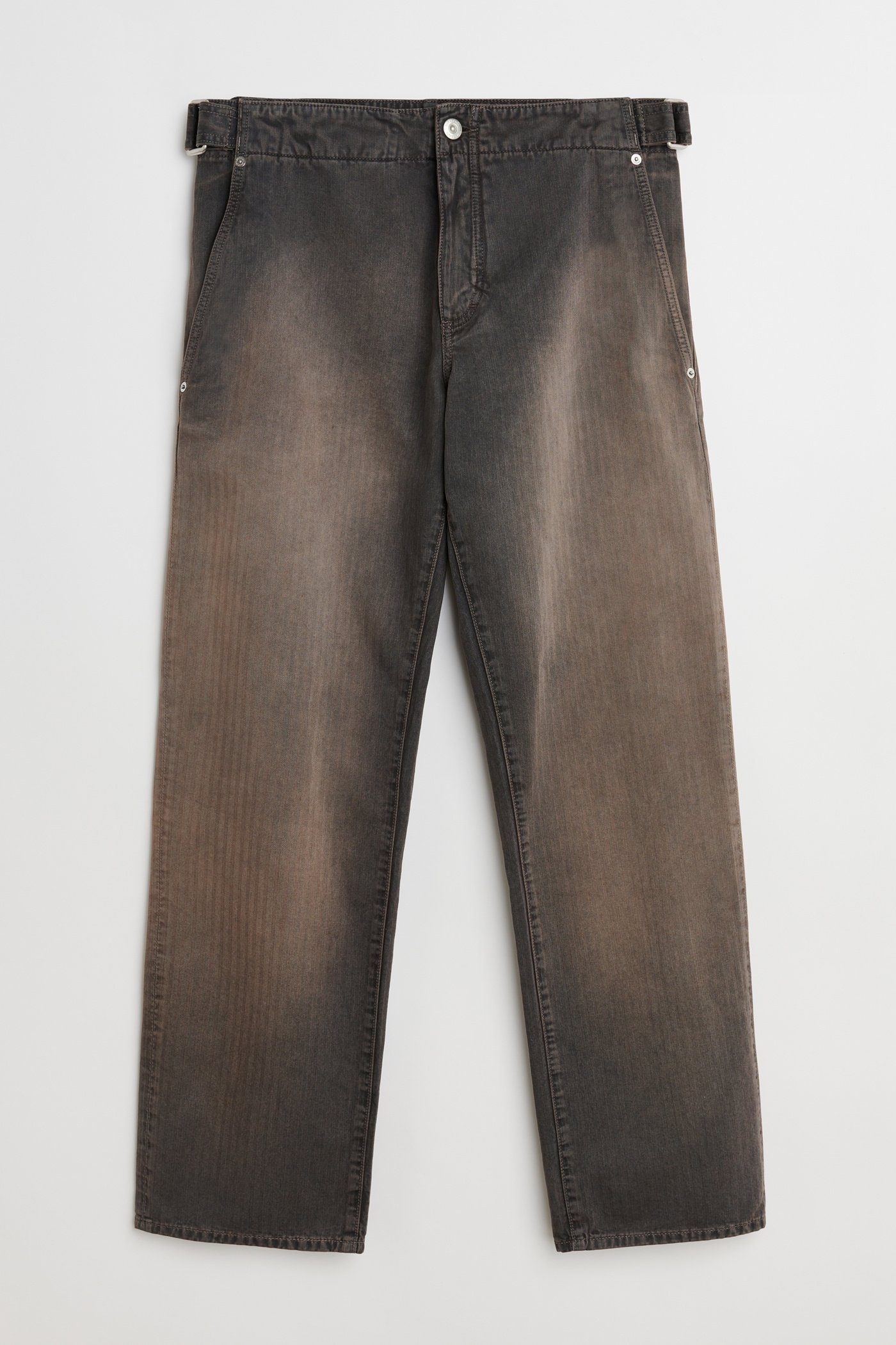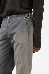 Details · Italian denim · 100% Cotton · Pigment dyed · Vintage sun fade wash · Flat fronted · Riveted side pockets · Adjustable waist tabs · Metal button · Zip fly · Two back pockets · Relaxed fit · M4245TF Description Our Trucker Trouser in French Sun Faded Herringbone. Produced in a pigment dyed Italian denim, with a vintage sun fade wash, the flat fronted mens Trucker Trouser has a relaxed fit and features riveted side pockets, adjustable waist tabs, a zip fly and two back pockets. This garment is manufactured using carefully sourced material with a unique treatment process that will give each garment an individual shade and appearance. This technique could result in some color bleed onto lighter garments or surfaces. The garment shall be shaped by its wearer and naturally distress over time to finish the design process.