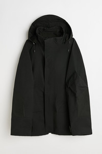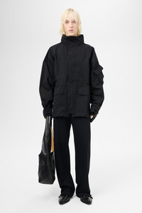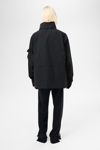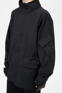 Details · Italian fabric · 100% Polyester · Funnel neck collar · Packable drawstring hood · Storm placket · Snap stud and hidden zip closure · Waist and hem drawstrings · Two front pockets · Adjustable cuffs · Patch pocket on sleeve · Patched elbows · Generous, boxy fit · M2251HSB Description Our Horizon Jacket in Static Black Papyrus Poly. Produced in a dense Italian polyester fabric, the men's Horizon Jacket has a generous, boxy silhouette and features a funnel neck collar, a packable drawstring hood, two large waist pockets with button closure, patched elbows and drawstrings at the waist and hem.