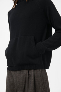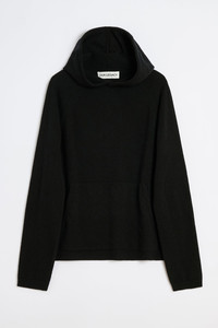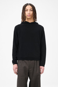 Details · Italian yarn · 100% Merino Wool · 1x1 rib knit · Hooded · Raglan sleeves · Patch pocket · 2x2 rib knit cuffs and hem · Relaxed, boxy fit · M4253KBC Description Our Knitted Hoodie in Black Cherub Wool. Produced in Italian Merino Wool yarn with a 1x1 rib knit construction, the men's Knitted Hoodie has a relaxed, boxy fit and features a hood, raglan sleeves, a patch pocket, and 2x2 rib knit cuffs and hem. This garment is manufactured using a carefully sourced yarn. The natural characteristics of the yarn, combined with the construction of the knit allows the garment to expand when worn. The garment shall be shaped by its wearer and naturally distress over time to finish the design process. To help keep the integrity of the garment please store the garment folded.