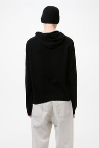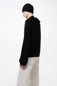 Details · Italian yarn · 100% Silk · Raglan sleeves · Patch pocket · 2x2 rib knit cuffs and hem · Relaxed, boxy fit · M2263KA Description Our Knitted Hoodie in Almost Black Refined Silk. Produced in Italian silk yarn, the Knitted Hoodie has a relaxed, boxy fit and features raglan sleeves, a patch pocket, and 2x2 rib knit cuffs and hem. This garment is manufactured using a carefully sourced yarn. The natural characteristics of the yarn, combined with the construction of the knit allows the garment to expand when worn. The garment shall be shaped by its wearer and naturally distress over time to finish the design process. To help keep the integrity of the garment please store the garment folded.
